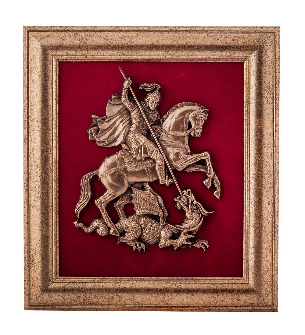 Прямоугольная рамка панно выполнена из пластика. Объёмное изображение геба Москвы изготовлено из меди методом гальванопластики. Подложка из бордового бархата.