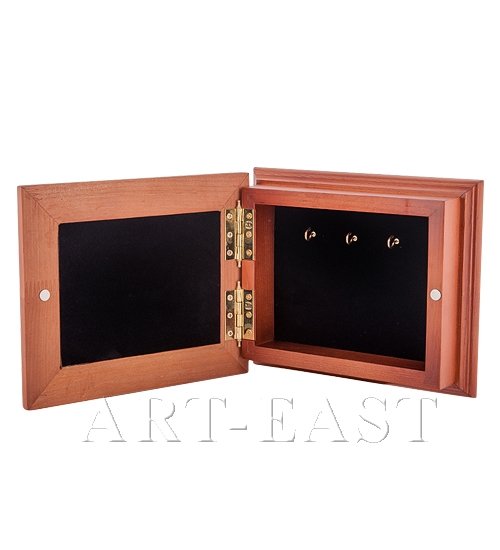 Настенная деревянная ключница с объёмным изображением картины из меди с применением метода гальванопластики. На крышке находится магнит. Крышка соединена с корпусом двумя латунными петлями. Внутри ключницы три крючка для ключей. На задней стенке есть подвесы для крепления ключницы на стену.
