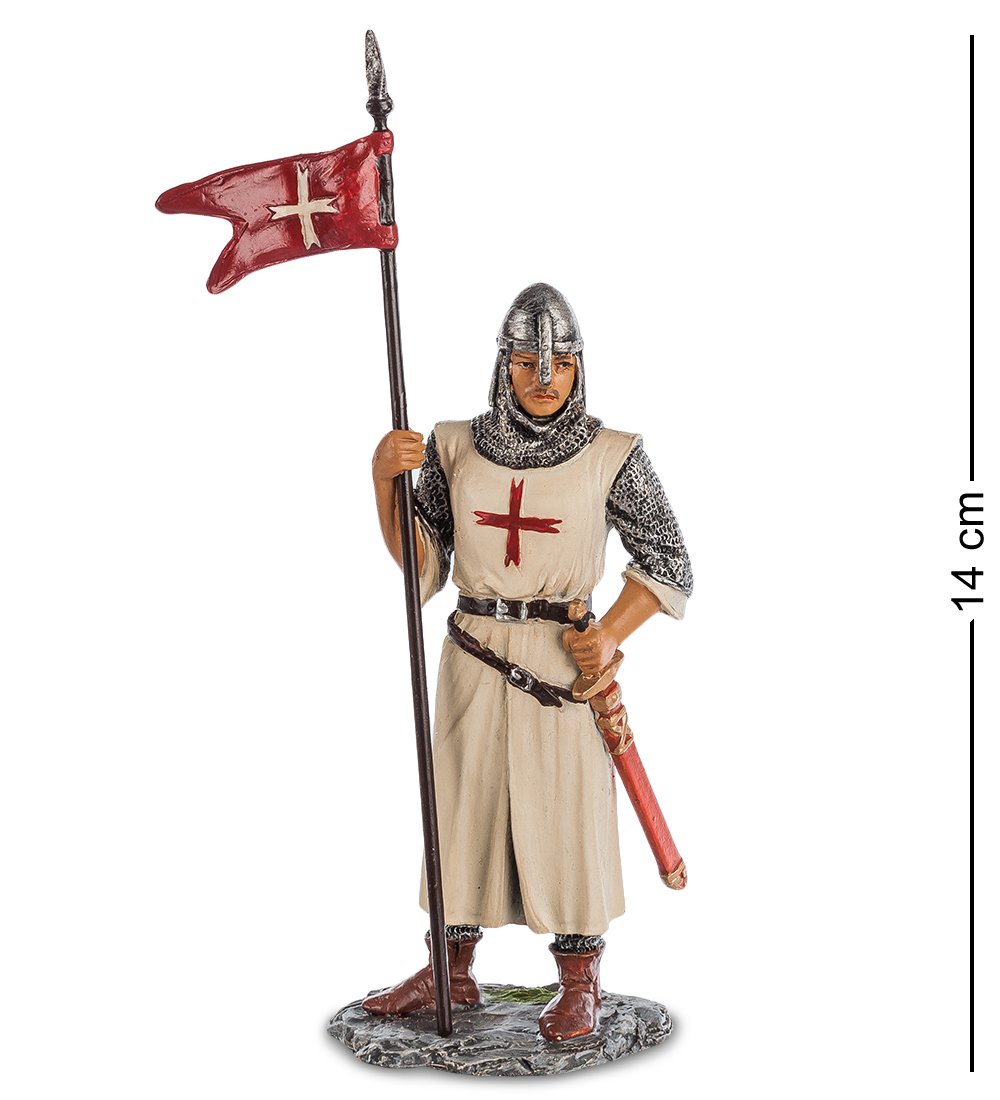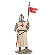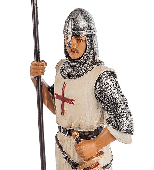 Статуэтка из олова «Рыцарь крестоносец» изображает средневекового воина с копьем, экипированного всем необходимым для военного сражения. На его голове прочный шлем, защищающий нос и переносицу, а нижняя часть головы защищена кольчугой, прикованной к шлему. Кольчуга покрывает все тело рыцаря, от шеи до щиколоток; поверх нее – серое одеяние из материи с красным крестом на груди.