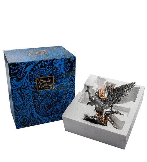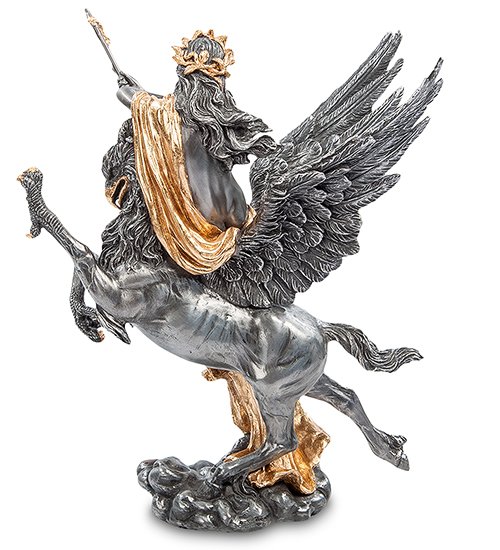 Судя по форме подставки, напоминающей облако, грифон находится в воздухе: копыта задних ног легко скользят в воздухе, а передними лапы птицы с большими когтями грифон пытается продраться через невидимую преграду. Женщина, небрежно оседлавшая чудовище, выглядит спокойной: на ее лице – довольная улыбка полного удовлетворения.