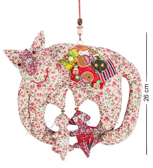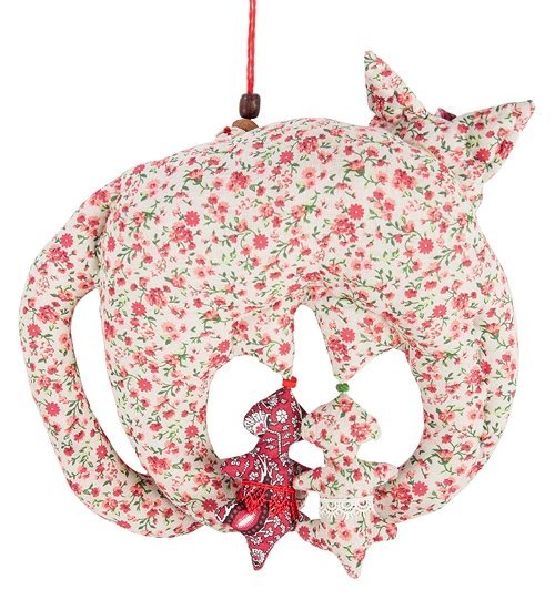 На теле кошечки создатель разместил несколько заплаток разного цвета: скорее всего, они символизируют материнский желудок, в котором, помимо прочего, находятся две небольшие рыбки. Кошка украшена бубенцами, которые зазвенят, когда ребенок коснется игрушки. Высота игрушки – 26 сантиметров; для подвешивания используется красный шнурок, украшенный несколькими разноцветными бусинами.