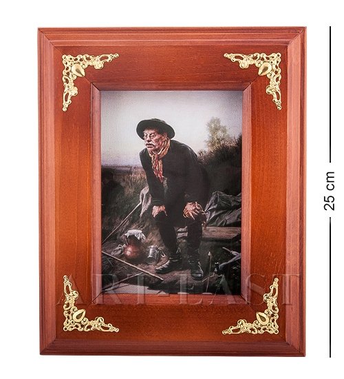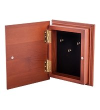 Ключница деревянная. Декоративная часть выполнена цветной печатью на холсте. Декорирование на раме изготовлено из меди с применением метода гальванопластики. Внутри ключницы одиннадцать крючков и отделка бархатом. Крышка закрывается с помощью магнита и крепится к основанию с помощью двух латунных петель. На задней стороне есть подвесы для крепления на стену.