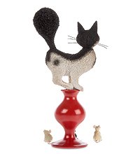 Изделие посвящено братьям нашим меньшим. В композиции изображен пушистый черно-белый кот, который взобрался на красный вазон и с интересом наблюдает за тремя маленькими мышками. Мышки, почуяв опасность, уже продумывают план побега, однако не известно, кто окажется быстрее и ловчее – они или кот?