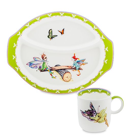 Хотите сделать ребёнку хороший подарок? Детский набор "Эльф" идеальный вариант! Этот набор состоит из тарелки и кружки с оригинальным рисунком. Цветовые тона этого яркого набора порадуют малыша. Тарелка очень необычная - она состоит из двух отделений. В одной части играют сказочные существа, а в другой - две летающие бабочки, с яркими и интересными цветовыми тонами.