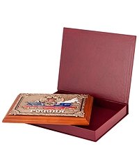 Настенное панно выполнено из дерева ценной породы с объёмным изображением символов Росии из меди с применением метода гальванопластики и с нанесением ювелирных эмалей. Города на карте России отмечены стразами сваровски. На задней стенке панно есть подвесы для крепления на стену.
