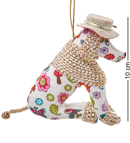 Собака изображена в сидячем положении. Ее тело сшито из материи, разукрашенной цветами (у нас имеется несколько игрушек разной расцветки). На голове собаки – красная матерчатая шляпа в белый горошек, украшенная разноцветными розами, а на шее – длинный воротник из бело-золотой парчи. Парчой также украшены уши и лапы животного. На мордочке пуделя можно прочитать удивление и ожидание: возможно, собака позировала в ожидании обильного ужина.