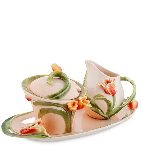 Гармония — это одна из определяющих основ чайного сервиза, в который входят сахарница и молочник «Тюльпаны». Выполненный на белоснежном фарфоре рельефный рисунок удивляет своей естественностью и совершенством. Сочетание нежного цвета свежей зелени и оттенков весенних цветов, позволяет настроиться на уютное чаепитие.