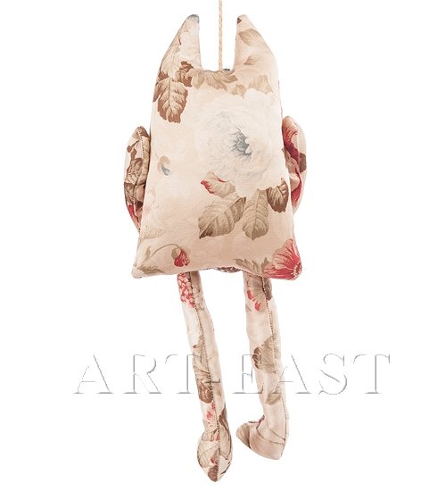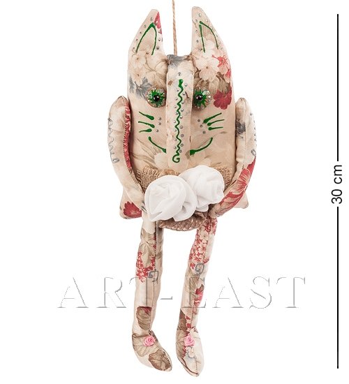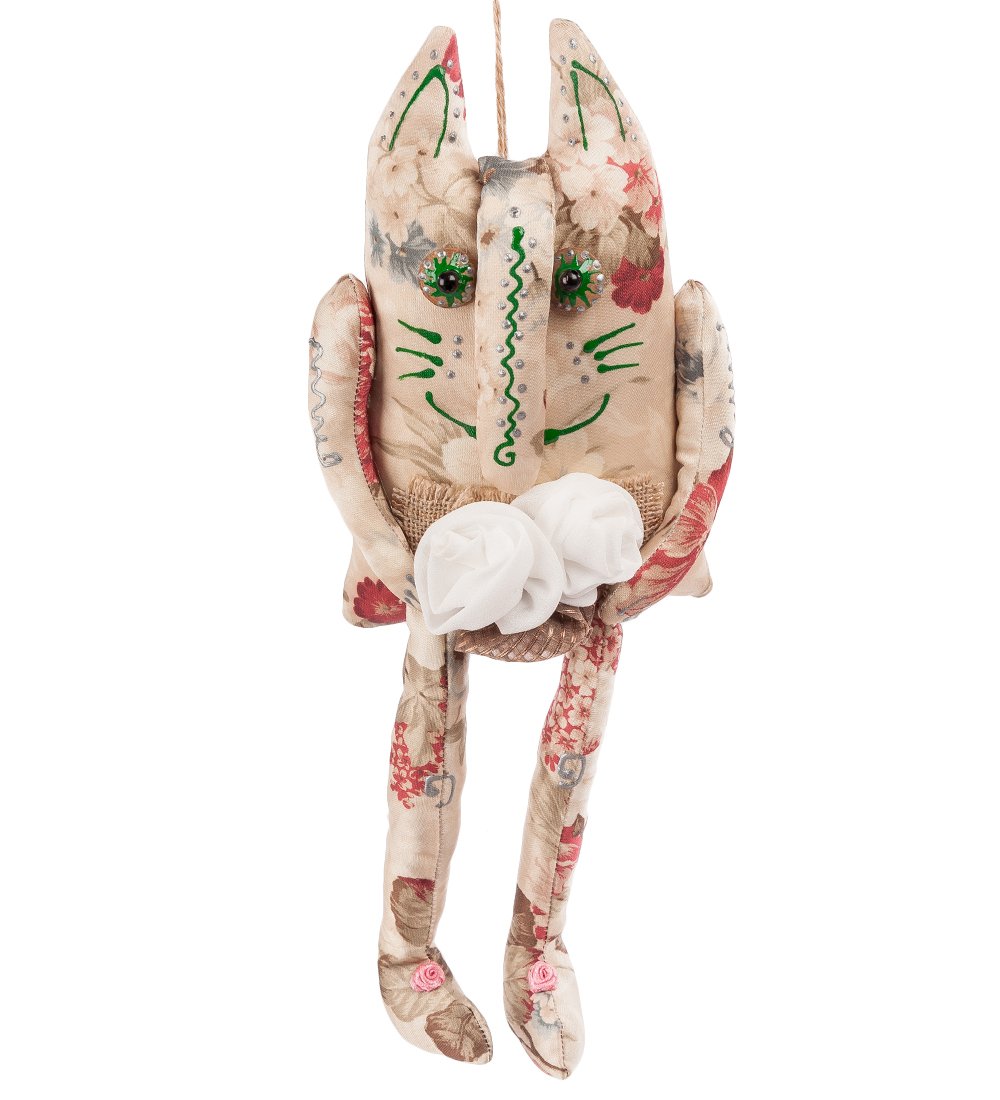 Кошка сделана из материи бежевого цвета, украшенной «цветочным» рисунком. Ушки домашнего животного украшены серебристыми кружочками. Таким же образом создатель игрушки украсил глаза, а хвост решил разместить спереди: он перевешен через голову и свисает вниз, как хобот.