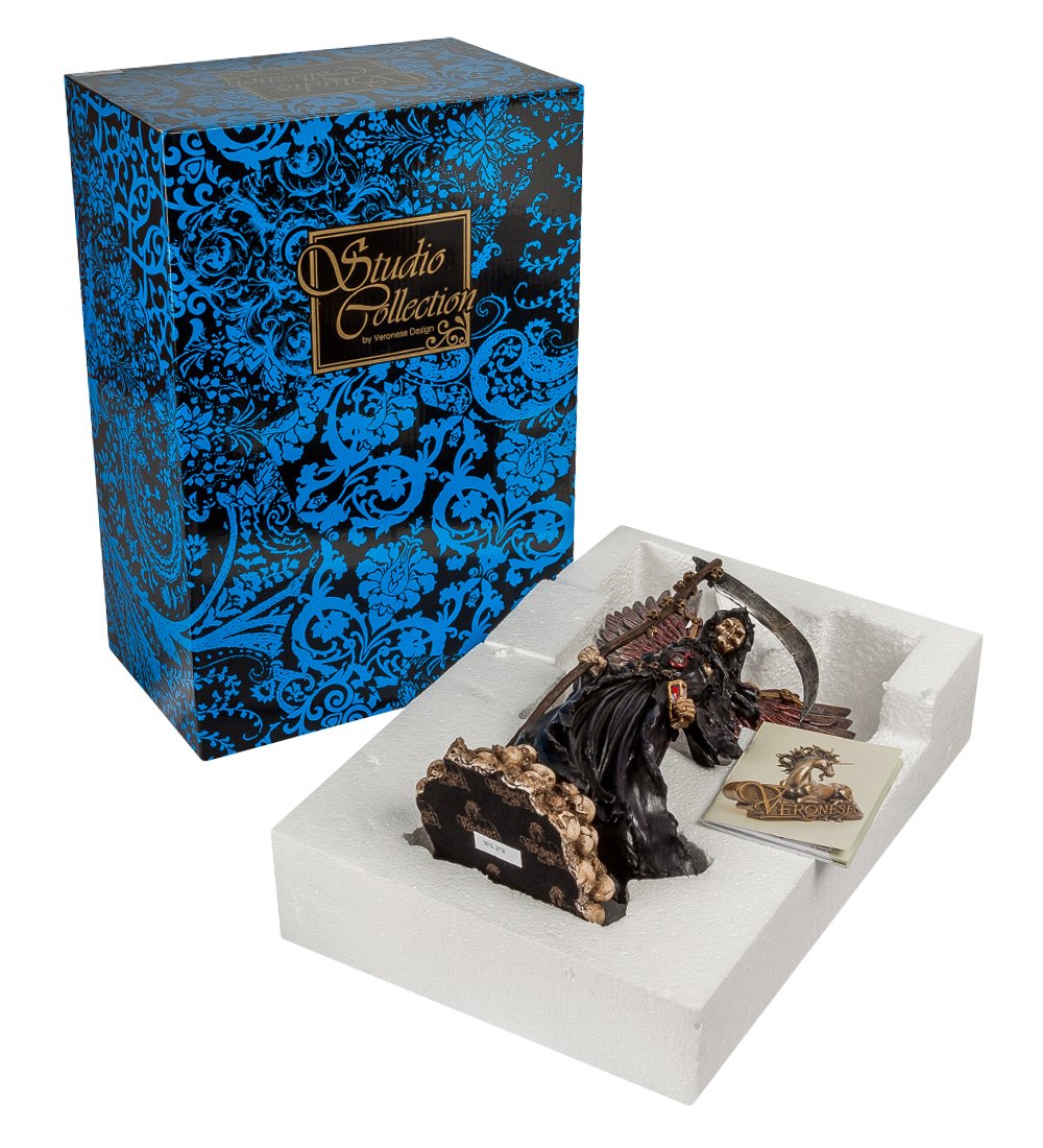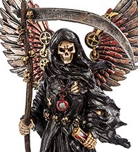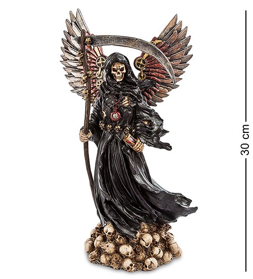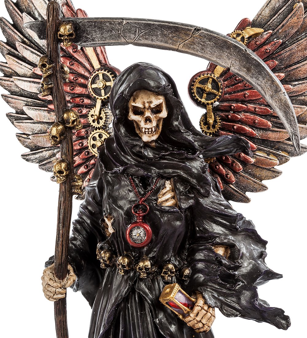 Предания гласят, что ангел смерти приходит за человеком чтобы препроводить его в мир мертвых. Иногда он появляется непосредственно в момент кончины, иногда предупреждает заранее, и умирающий понимает, что совсем скоро ему придется расстаться с земной жизнью. Ангел смерти присутствует во множестве мифов и религий, и все изображают его по-разному. Создатели статуэтки в стиле «стимпанк» изобразили проводника в мир теней в виде крылатого скелета, одетого в черные лохмотья, с длинной косой и песочными часами.