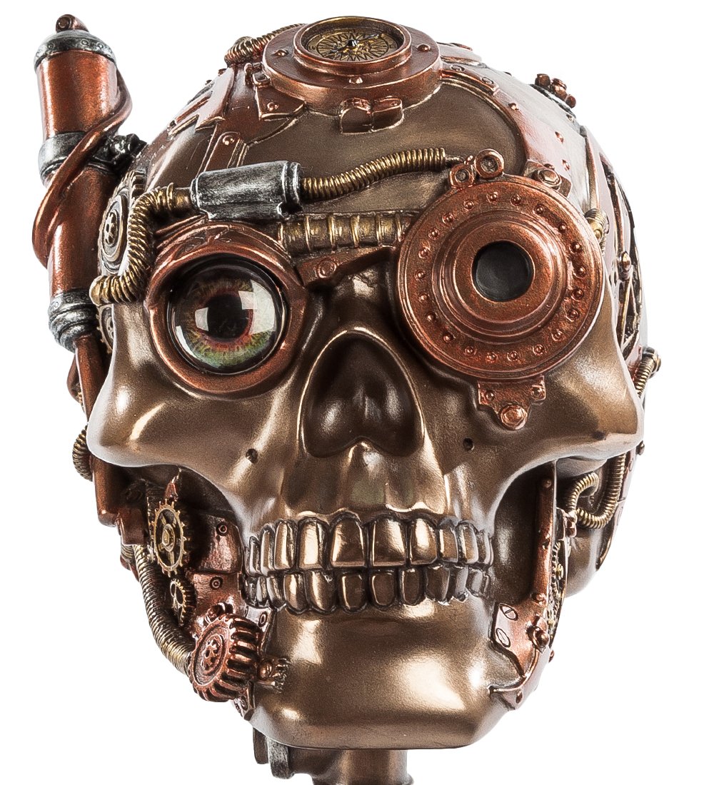 Металлическая инсталляция в стиле «стимпанк» представляет собой красиво и необычно оформленный череп из металла платинового цвета. Он установлен на подставке-шестерне, и чем-то напоминает голову профессора Доуэля – то ли пронзительным взглядом стеклянного глаза, то ли спокойствием, которое хранит его механика. Установив такую статуэтку на рабочем столе, можно потерять несколько минут, глядя черепу в глаза и пытаясь понять, что он от вас хочет.