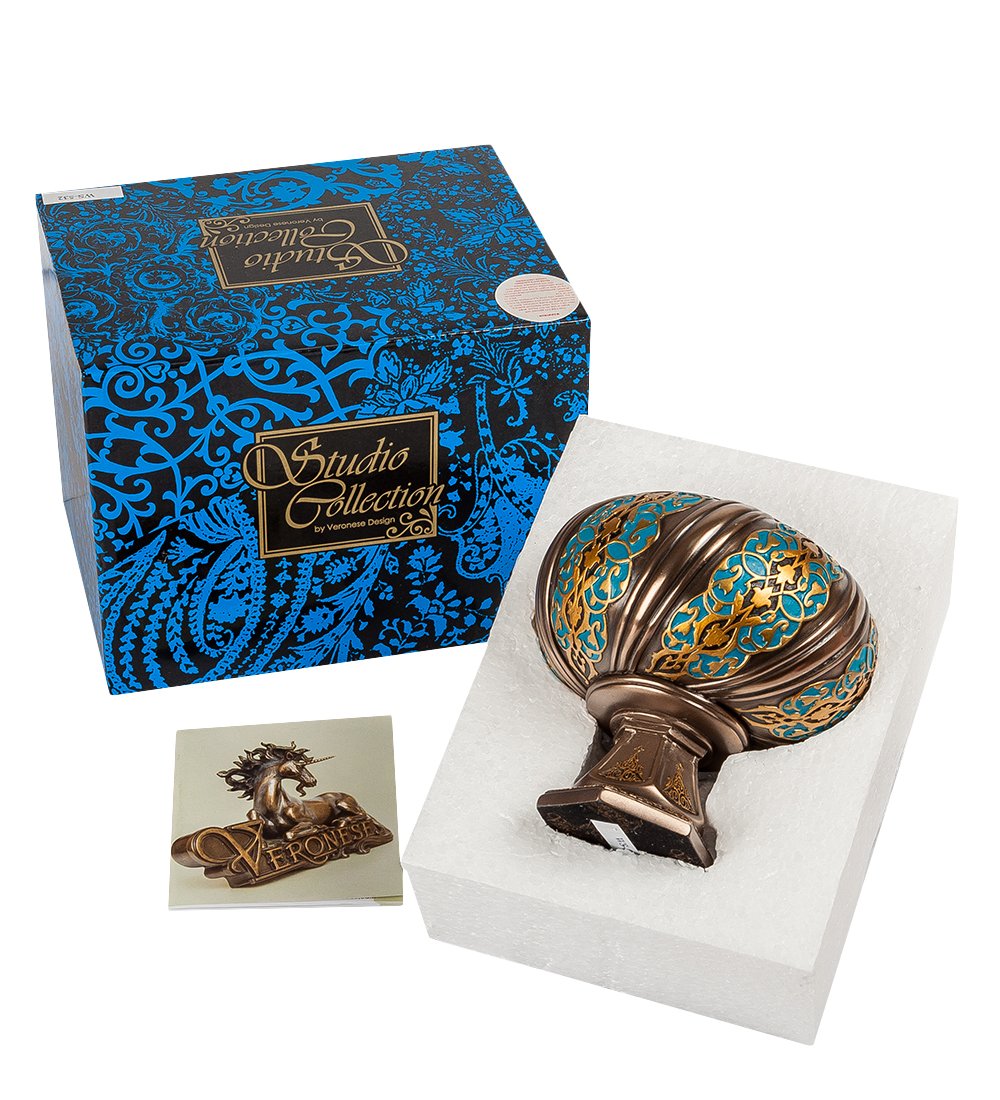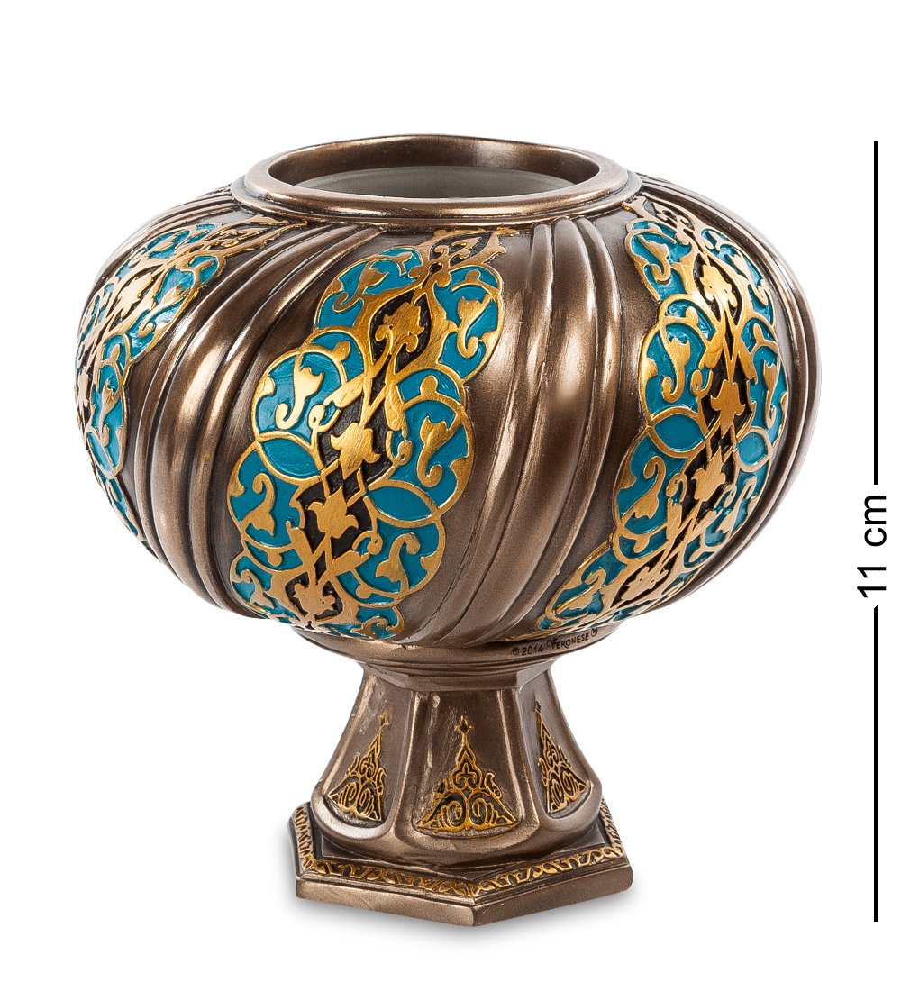 Подсвечник с орнаментом выполнен в виде вазона. Широкая круглая горловина держится на устойчивом, шестигранном основании. Автор хотел изобразить подсвечник в бронзе, поэтому выбран коричневый с перламутром цвет. Яркие голубые с позолотой узоры придают подсвечнику торжественность и необычность. Подсвечник будет гармонично смотреться в любом интерьере от классики до хай-тека.