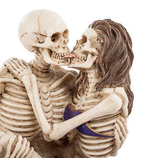Надпись «Love Never Dies», нанесенная на подставку статуэтки, изображающей двух скелетов в страстном поцелуе, переводится как «Любовь не умирает»: именно так называется забавная статуэтка, посвященная любви и смерти, которые, как известно, идут рука об руку. Скелет мужчины одет в длинные легкие штаны из синего ситца, которые часто носят туристы, посещающие жаркие страны. Тело девушки, от которой остались кости и волосы на черепе, одето в легкий фиолетовый купальник. Скорее всего, пара потерпела кораблекрушение и решила остаться вместе на морском дне, покрытом водорослями, ракушками и морскими звездами.