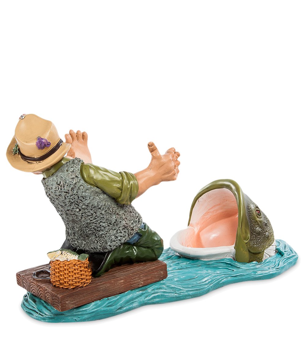 Какая-то странная реакция у этого рыбака. Приплыла к нему чудо-юдо рыба размером почти с кита, а он от нее отвернулся и руками размахивает. От радости, наверно, крыша поехала. Но оказывается, некоторые оригинальные статуэтки обладают еще и функциональным назначением. Попробуйте поставить в пасть рыбы бутылку вина, наклонив ее так, чтобы она легла прямо в поставленные руки рыбака.