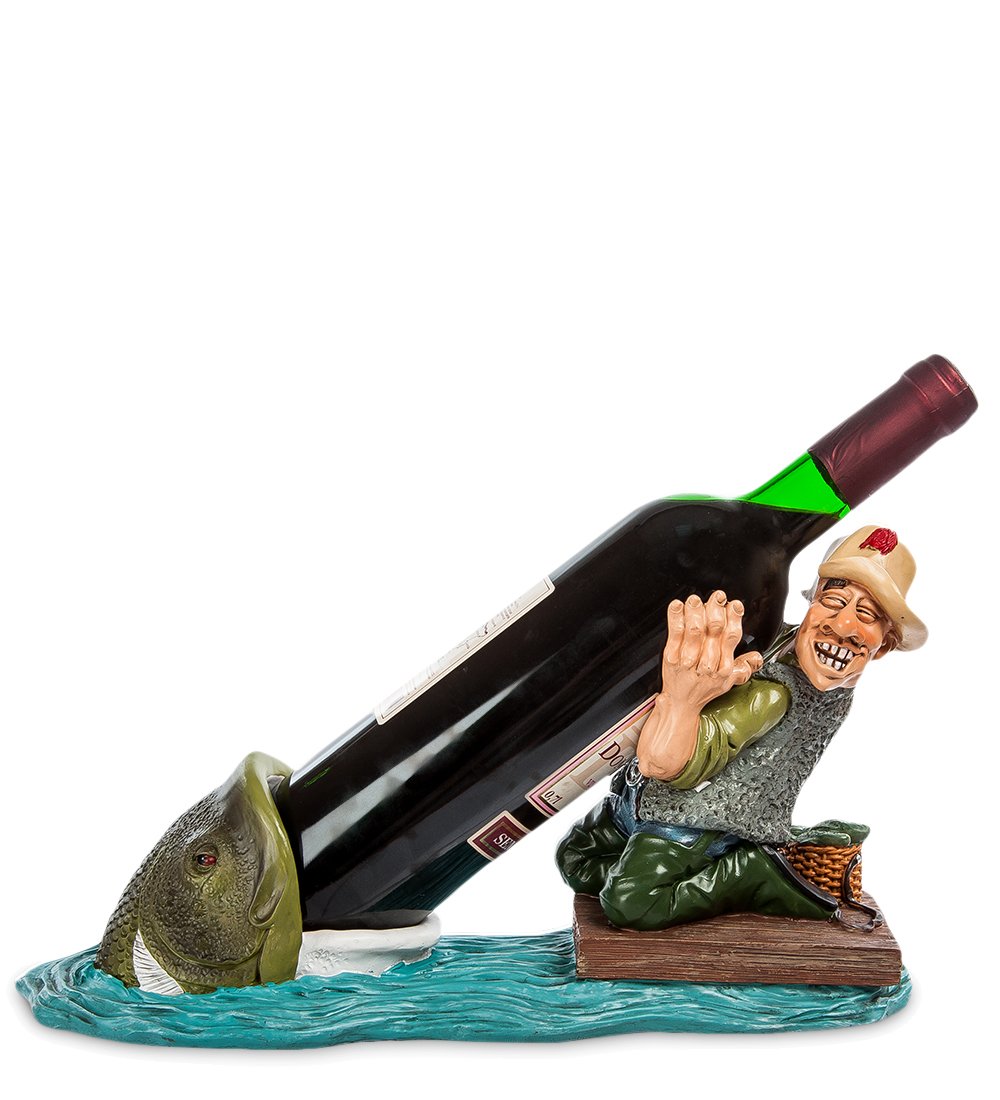 Подставка под бутылку с фигуркой рыбака длиной 32 см станет незабываемым подарком для любителей рыбалки и оригинальным украшением стола.