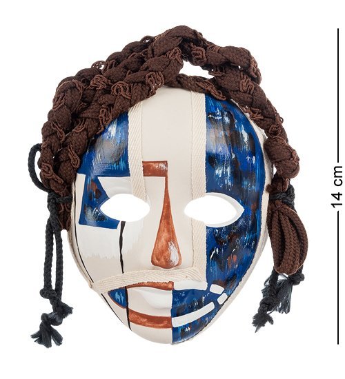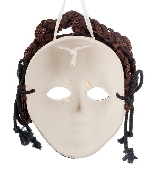 Коричневые волосы из тканых веревок, выступают ярким, невероятно выделяющимся акцентом на фоне всей маски. Все элементы собранные воедино создают удивительно красочную и превосходную по своему качеству маску.