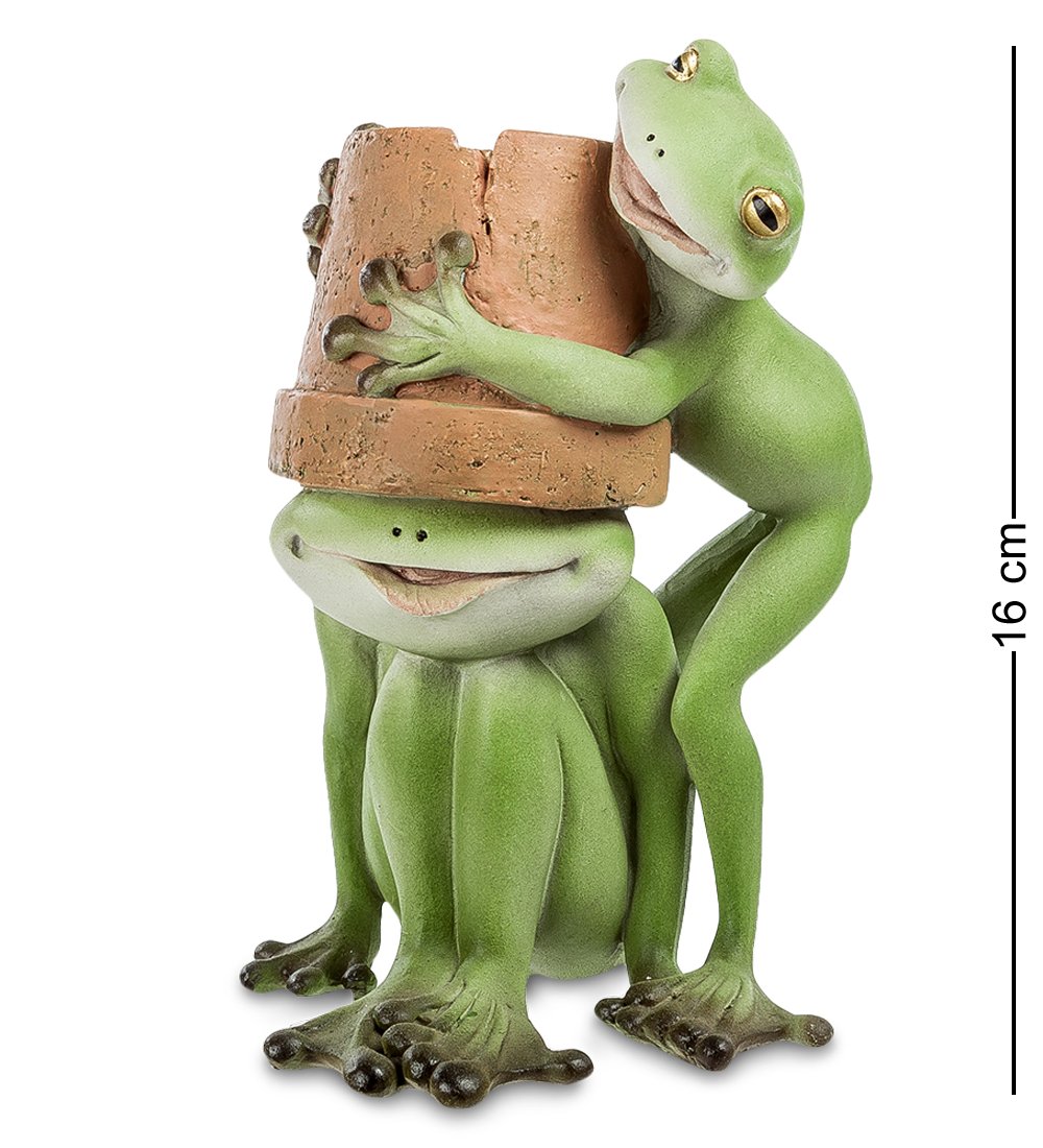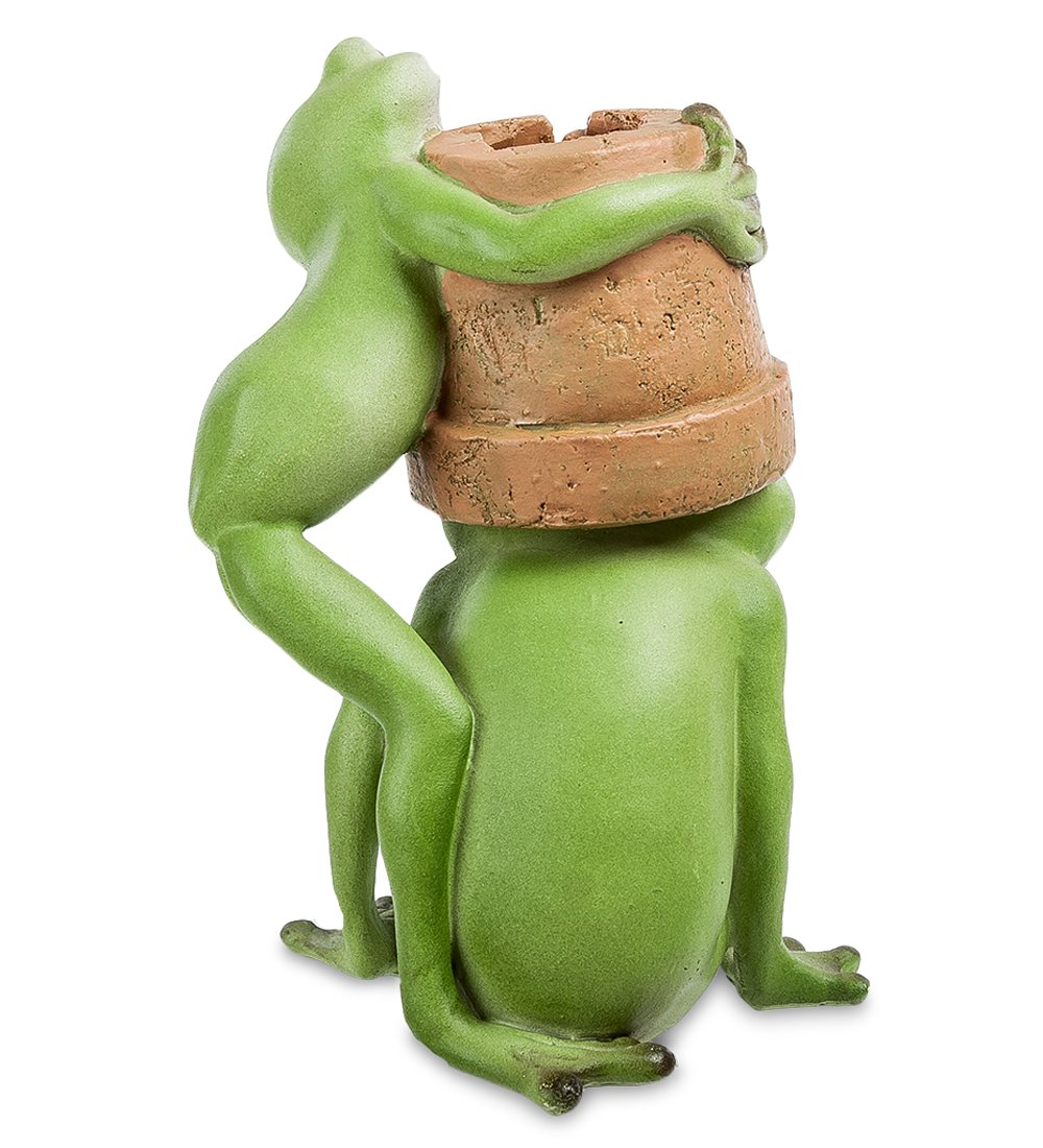 Баловство малышей может иметь весьма неприятные последствия. Стоило лягушке-маме на минуту упустить из виду своего лягушонка, как он подобрал где-то тяжелый глиняный горшок и взгромоздил его на мамину голову. Больно же! Лягушка с трудом терпит, но не решается делать резких движений, чтобы не причинить вреда своему проказнику-сыночку. А тот доволен – как же: у мамы такая прикольная шляпа! Так что внимательнее следите за своими детьми, от них всего можно ожидать. А к этой композиции – присмотритесь: дно у горшка выбито, и его даже в таком виде можно использовать для посадки комнатного растения. Получится очень красиво.