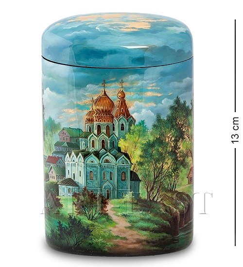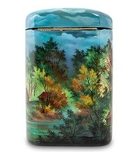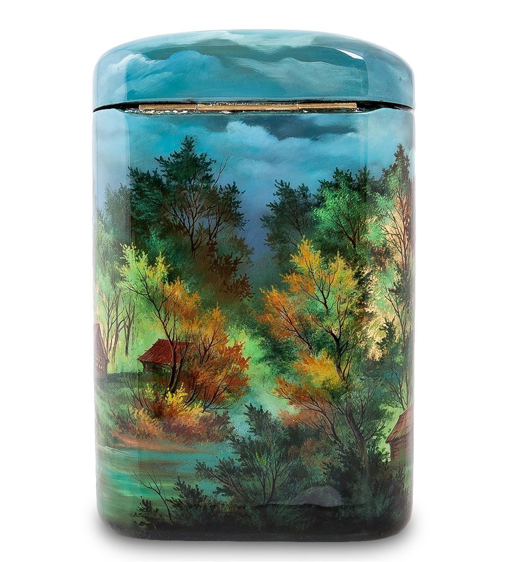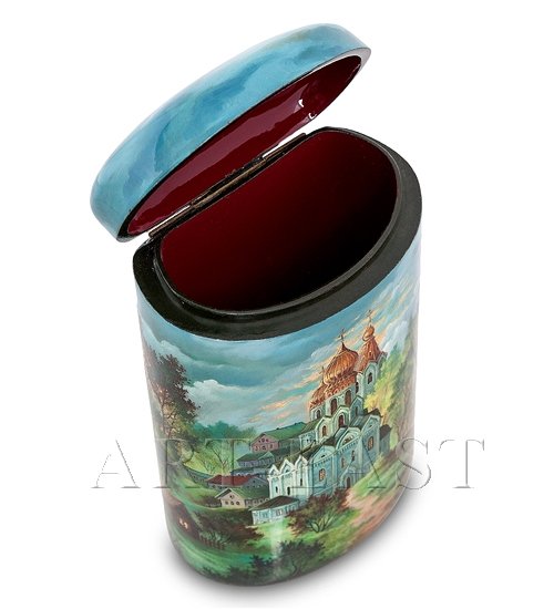 Портсигар представляет собой высокую коробочку, в которую поместятся даже самые длинные сигареты. Внутреннее пространство велико, поэтому часто наполнять портсигар сигаретами не придется. Портсигар-шкатулка имеет форму овального цилиндра, в верхней части которого находится крышка. Он ярко, празднично раскрашен: на передней части коробочки нарисован большой русский монастырь, на задней – пейзаж: осенний лес и небольшой домик около пруда.