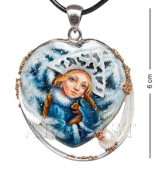 Кулон «Девочка-сова» небольшого размера (его высота – всего 6 сантиметров). В центре кулона, на овальной лакированной поверхности изображено лицо девочки-подростка. За счет оформления и аксессуаров лицо девочки действительно немного напоминает круглую мордочку совы, и совы, заметив родственную душу, облюбовали ее прическу, поселившись сразу за границей тонкой косы в густых, волнистых волосах.