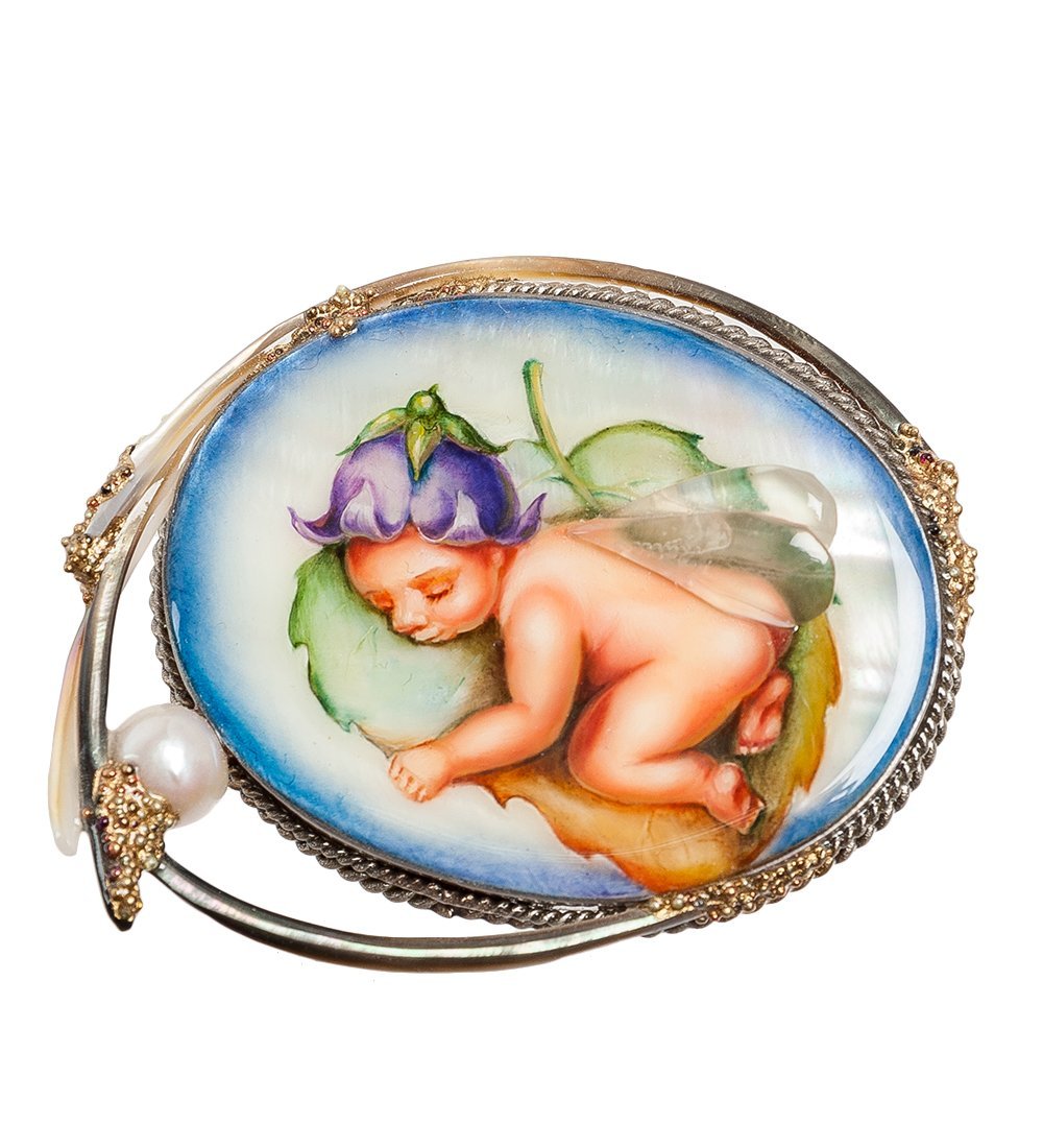 Нежные чувства, в которые многие с удовольствием погружаются в зрелые годы, начинают проявлять себя еще в детстве: дети, которые, как правило, искреннее взрослых и не столь эгоистичны, также способны на любовные подвиги и проявление ласки. Брошь «Влюбленные», украшенная миниатюрным изображением, демонстрирует двух детей, одетых в русские народные костюмы.