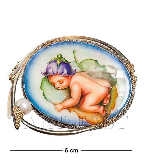 Изображение помещено в красивую круглую оправу, с боков которой находятся две искусственные жемчужины. Брошь можно подарить молодой девушке, остро переживающей первые муки влюбленности, или жене, с которой вас связывают долгие отношения, начавшиеся еще в детстве.