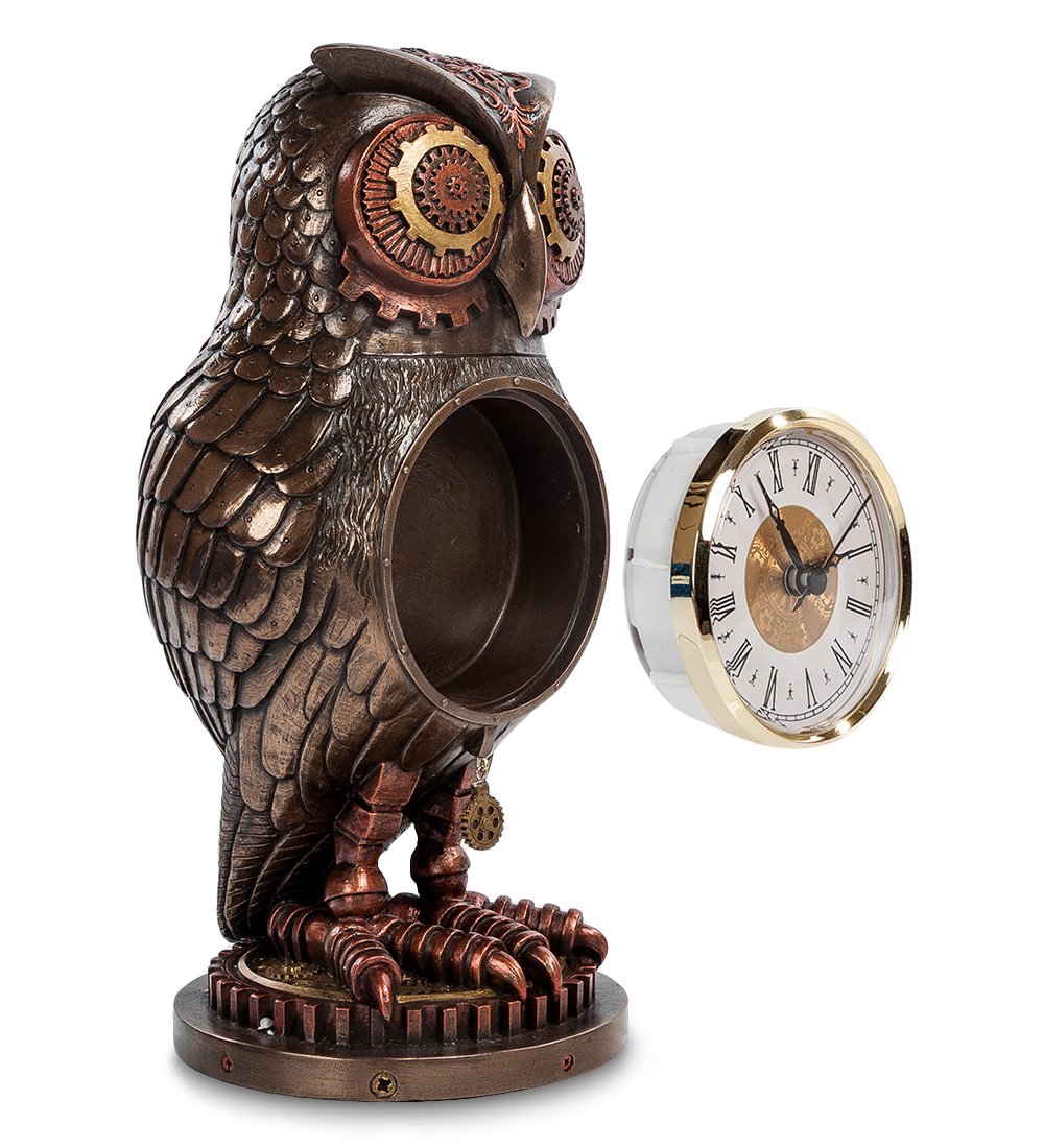 Часы, встроенные в статуэтку совы, не просто показывают время, а как бы призывают относиться к уходящим в прошлое секундам по-философски. Связь мудрого образа совы с многочисленными шестеренками, символизирующими точность определения времени, вполне понятна: надо уверенно смотреть в будущее и, прочно вцепившись когтями, держаться за настоящее.