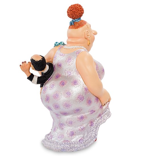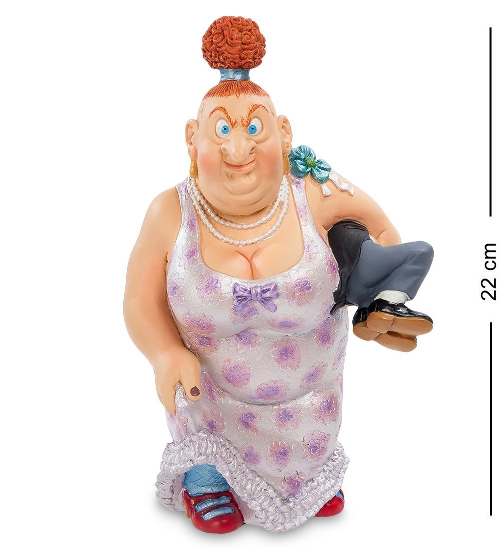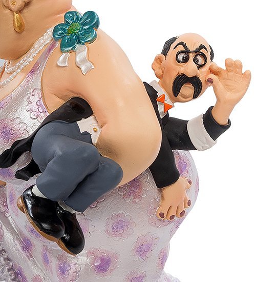 Доигрался мужичок. Обратил внимание на роскошных форм женщину – думал, что просто так, а получилось навсегда. И вот она его в ЗАГС тащит, как могла принарядилась, формы свои пышные в платье засунула и – вперед, широкими шагами. А мужичка, который тоже, похоже, к торжеству готовился, не ведет за собой, а несет подмышкой – чтобы не сбежал. Да он и не собирается сбегать, просто неловко ему в таком положении. Что ж, счастье семейное – оно разное бывает.