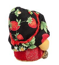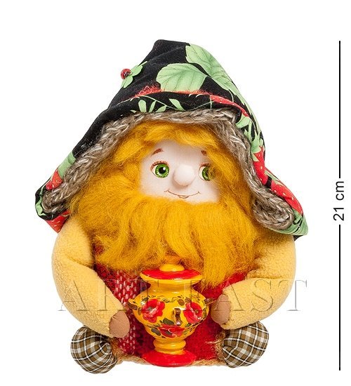 На голове гнома – большая панама, прикрывающая шевелюру рыжих волос. На лице подземного жителя приятная, нежная улыбка; гном улыбается не только губами, но и зелеными глазами. Одежду игрушечного человечка составляют желтая фуфайка и красный комбинезон, а на его ногах – клетчатые ботинки. В руках гном держит небольшой желтый самовар, украшенный красными цветами.
