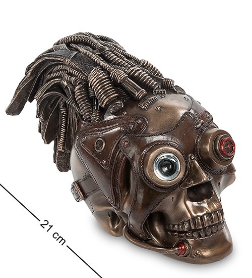 Статуэтка «Череп», выполненная в стиле «стимпанк», понравится тем, кто увлечен техникой и смело смотрит в будущее. В мире машин нет ограничений: в любой предмет можно вдохнуть жизнь, а человеческие останки не символизируют смерть или опасность. Наш череп не вызывает неприятных ассоциаций или страха; он вполне дружелюбен, хотя и напоминает Терминатора без грима. Отсутствие волос и кожного покрова компенсируется проводами и устройствами, заменяющими черепу утерянные органы чувств.