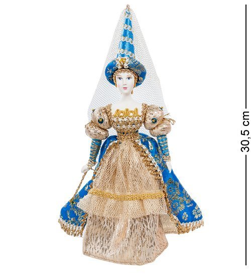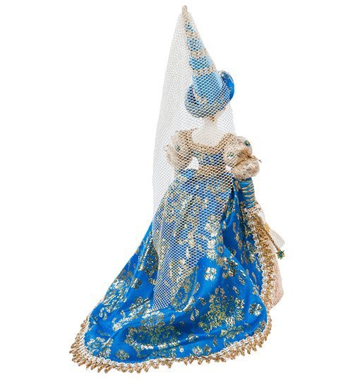 Фарфоровая кукла «Фея» демонстрирует женщину-волшебницу в наряде, в котором ее, вероятно, представляли писатели, создававшие сказочные новеллы несколько столетий назад. Девушка сделана из фарфора, а ее наряд – из красивой материи золотистого и бирюзового цветов. На девушке пышное голубое платье с широкой бежевой юбкой (такие платья носили при дворе в 17-м веке).