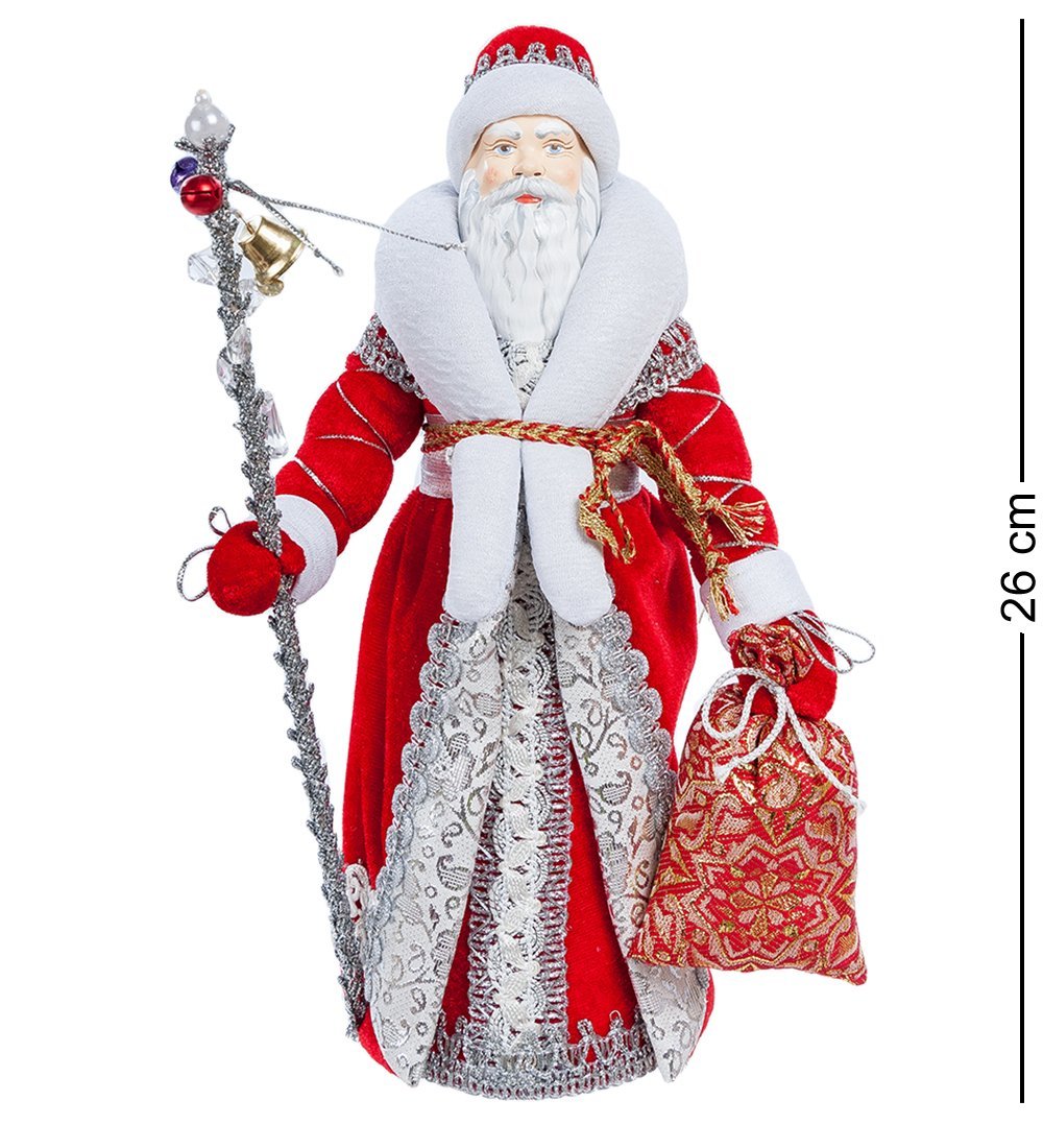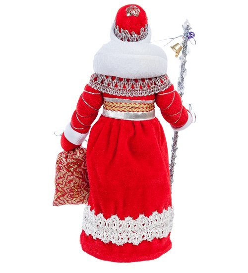 Богато одет, как настоящий король зимы, он будет величаво наблюдать за маленькими шкодниками. Лицо сделано из фарфора, а на нем голубые, как зимнее небо, глаза, морозный румянец, густые седые брови и алые губы. Теплый наряд навевает атмосферу уюта, радости, а сам образ Деда Мороза предвкушение величайшего праздника.