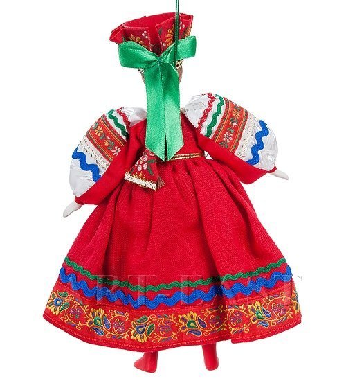 Широкая юбка, яркий орнамент, золотые бусы и красные ботиночки. Зеленый, красный, синий, белый – танец цветов и линий объединился в русском национальном костюме, на кукле «Феврония». Личико исполнено из качественного фарфора, на нем вырисованы голубые глаза, розоватые губки, бровки и легкий румянец. Кукла станет прекрасным подарком коллекционеру, или любителю русской культуры. Будет ярким предметом декора, принося в дом тишину и понимание.