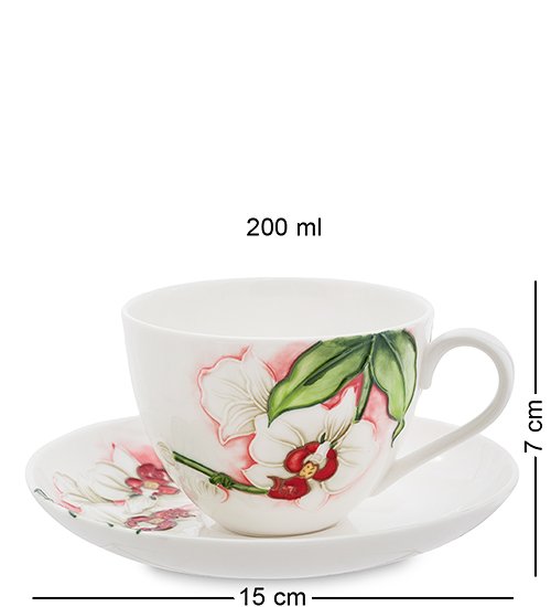 Поверхность белоснежного фарфора украшена рисунками, выполненными в виде королевской орхидеи. Ручная роспись выглядит настолько реалистично и жизненно, что, кажется, будто бы цветы истончают удивительно тонкий и нежный аромат.