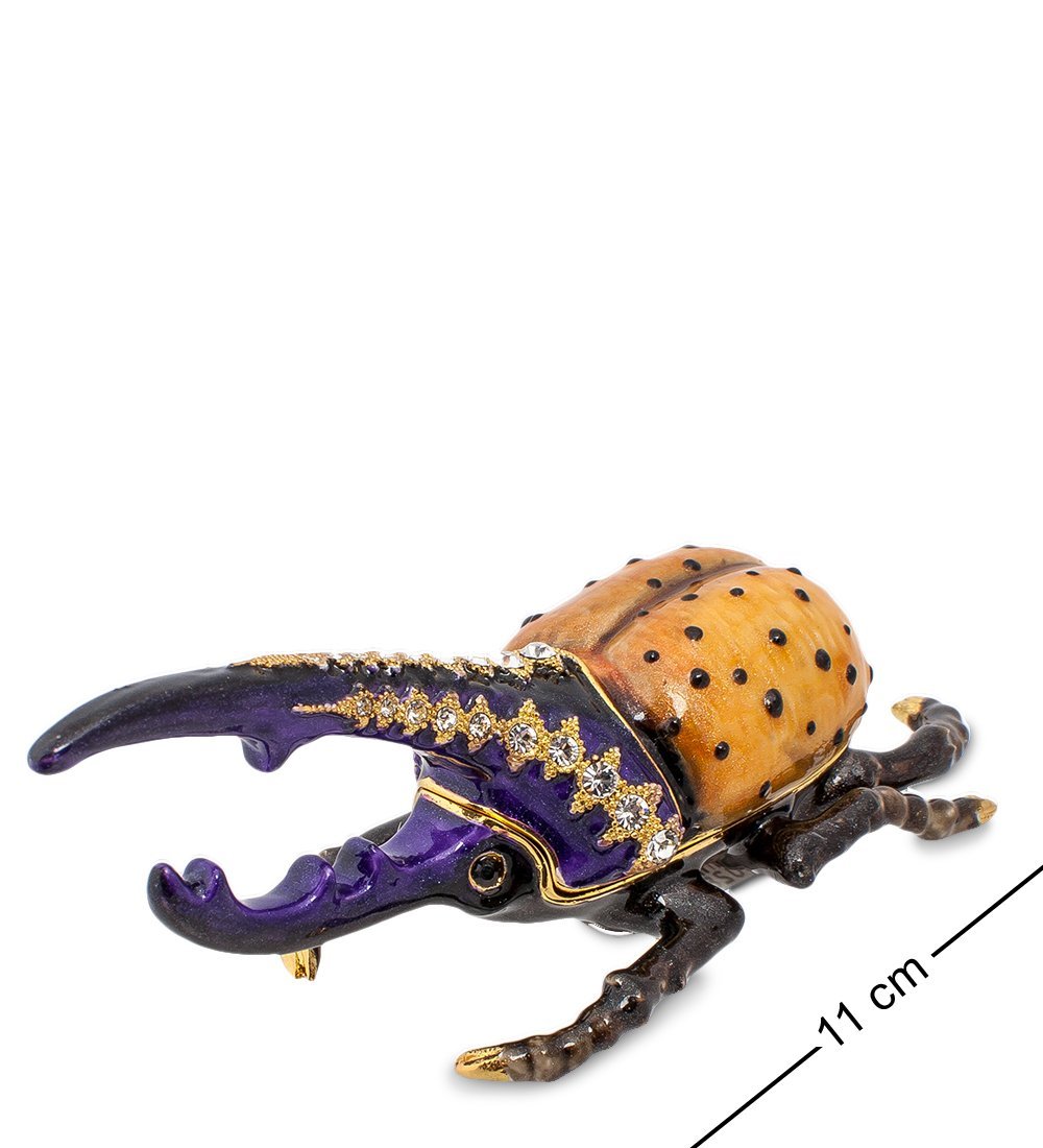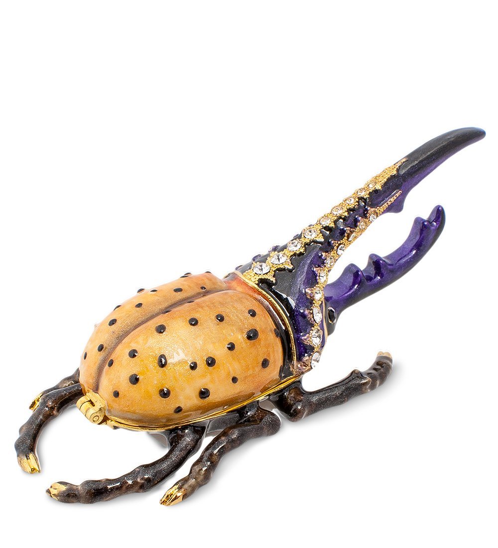 Впрочем, приглядевшись к роскошным синим рогам, понимаешь, что никто кусаться не будет: по рогам идет явно искусственного происхождения орнамент, инкрустированный кристалликами. Оказывается, внутри жука – пусто, верхняя часть его тела снимается, причем верхний рог служит ручкой своеобразной крышки, и жук – это на самом деле шкатулка, в которой можно хранить различные украшения небольших размеров. Ну, а внешность жука-шкатулки, весьма устрашающего на вид, призвана охранять содержимое от посторонних взглядов.