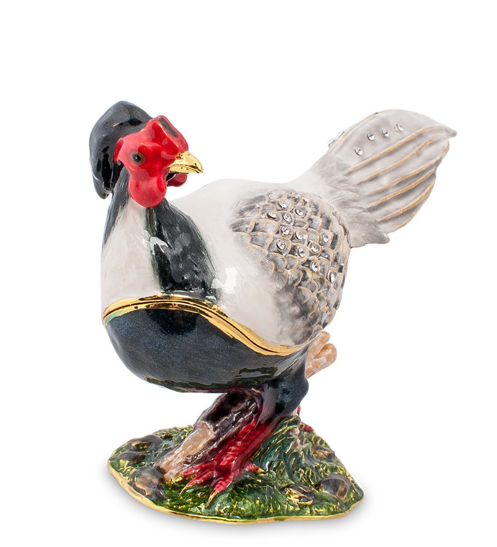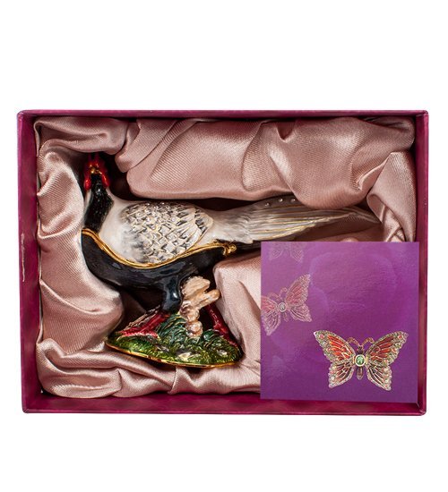 По кромке крыла проходит линия разделения – верхняя часть фигурки фазана откидывается на петле, расположенной под хвостовыми перьями, открывая доступ в удобную шкатулку. Пространство ее невелико, но сложить в нее набор украшений на каждый день или запас драгоценностей на случай торжественного выхода в свет вполне возможно. Впрочем, решать, что будет хранить под своими серебристыми перьями фазан, будет его новая хозяйка.