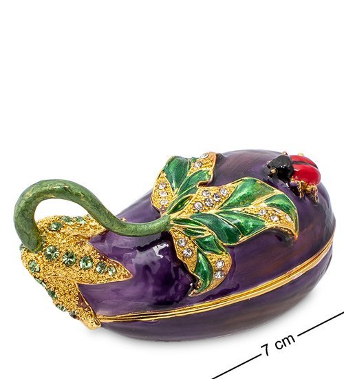 Этот баклажан не просто как настоящий – он лучше настоящего! Изумительный цвет ярче, а листья и черешок с позолотой и стразами вообще в природе не встречается. Даже жучок, присевший на баклажан, изумительно красив. Перед вами, скорее, ювелирное изделие, а не овощ. А если баклажан открыть по линии разъема, внутри откроется свободное место оригинальной шкатулочки, в которой можно хранить всевозможные полезные мелочи. Удобно и очень красиво!