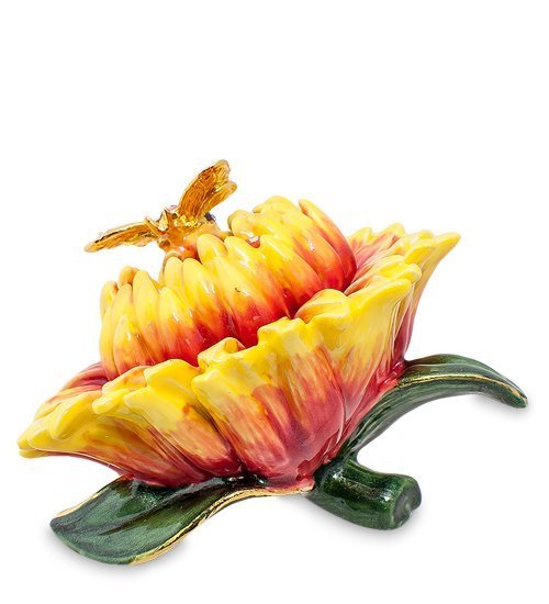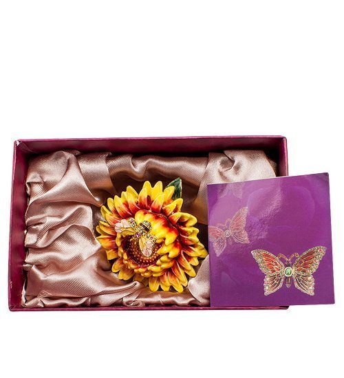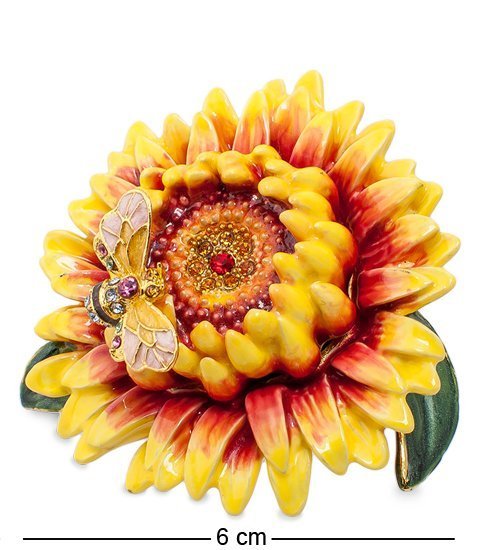 Цветок подсолнуха скрывает в себе секрет: не полностью распустившаяся часть его может сниматься, и внутри открывается пространство шкатулки. Конечно, в 6-сантиметровый цветок много не сложить, но пара сережек, колечки и цепочка поместятся. Вот такое удобное хранилище для драгоценностей.