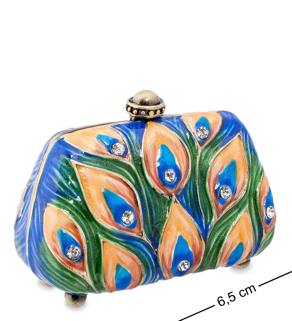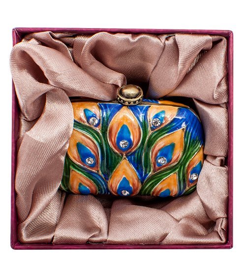 Эта маленькая шкатулочка выполнена в виде дамской сумочки красиво и пестро раскрашенной. По голубому фону – павлиньи перья, в которых переливаются зеленые, желтые, синие оттенки, а в центре каждого пера находится блестящий страз.