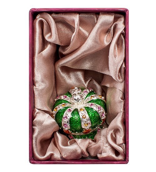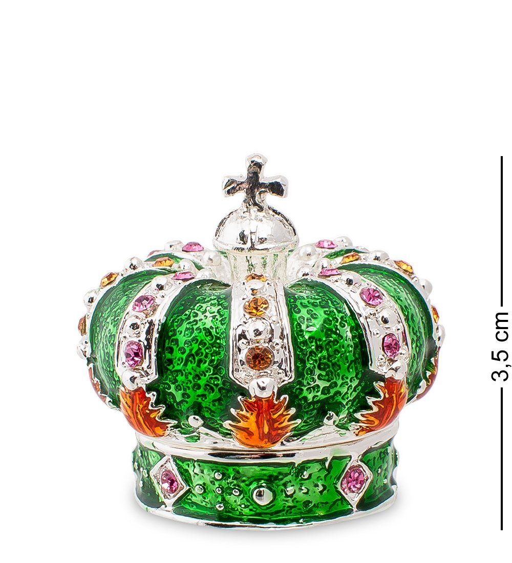 Шкатулка в виде короны выполнена из металла. Поверхность изделия покрыта полупрозрачным материалом изумрудных тонов, который усыпан мерцающими камнями и стразами. В декоре шкатулки присутствуют серебряные вставки, благодаря чему кажется, что изделие изготовлено из натурального серебра.
