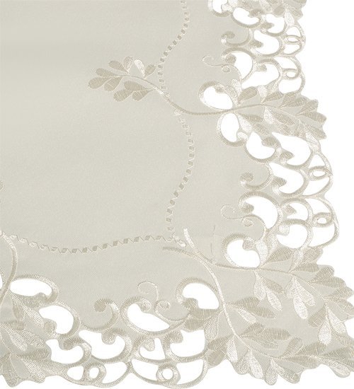 Скатерть белая квадратная. По краю набивной рисунок гладью белой нитью. В центре вышивка в виде круга.
