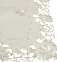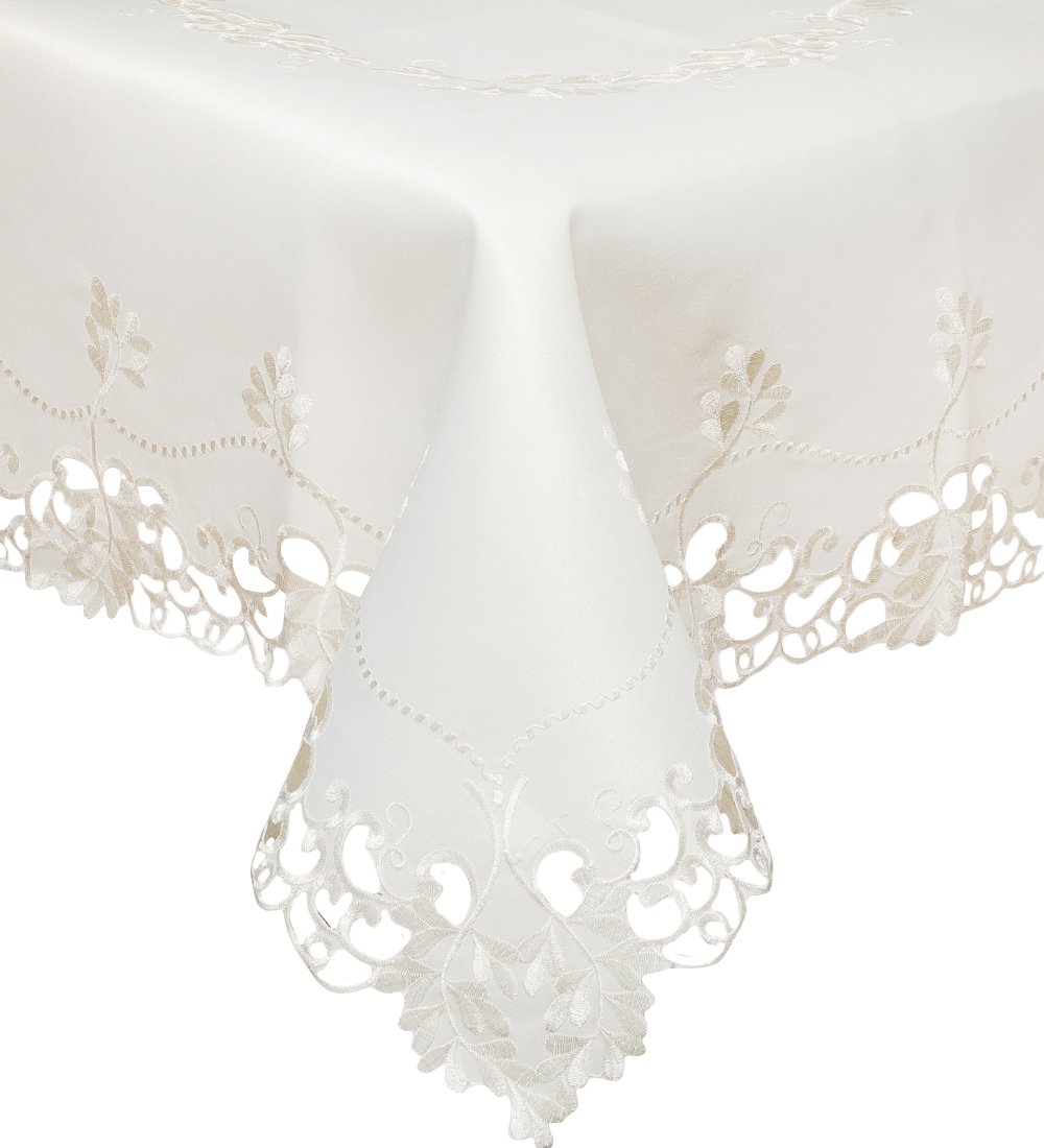 Скатерть белая квадратная. По краю набивной рисунок гладью белой нитью. В центре вышивка в виде круга.