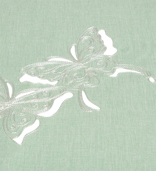 Обеденная скатерть прямоугольная бледно-зелёного цвета. Край ровный подвёрнут и подшит. По уголкам скатерти выбиты белой нитью по 2 бабочки. В середине скатерти также вышиты бабочки.