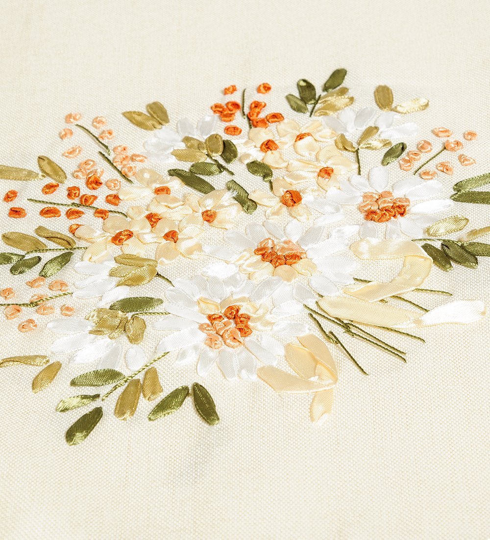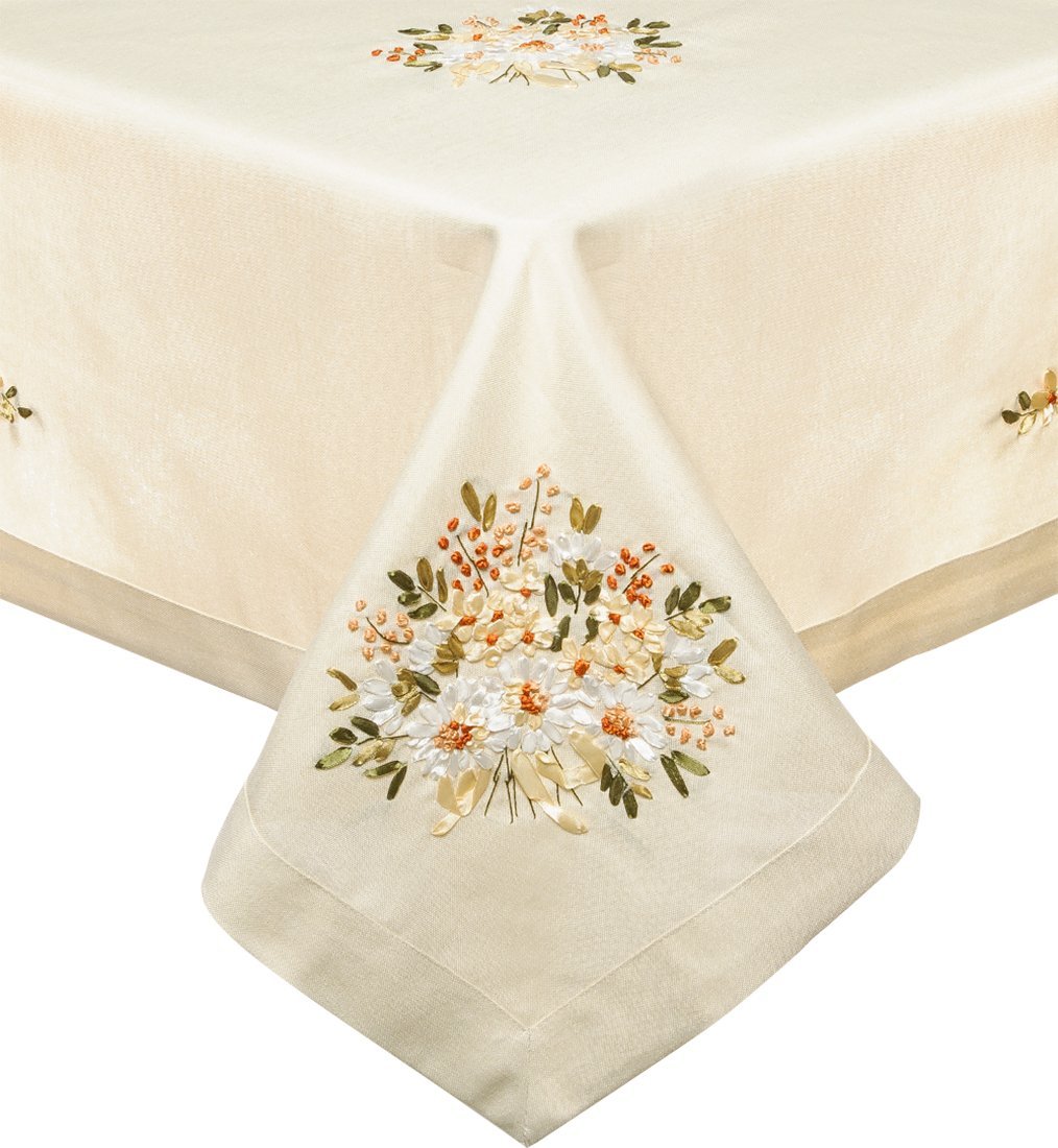 Скатерть прямоугольная кремового цвета. В уголках и центре набивная объёмная вышивка разноцветными атласными лентами.