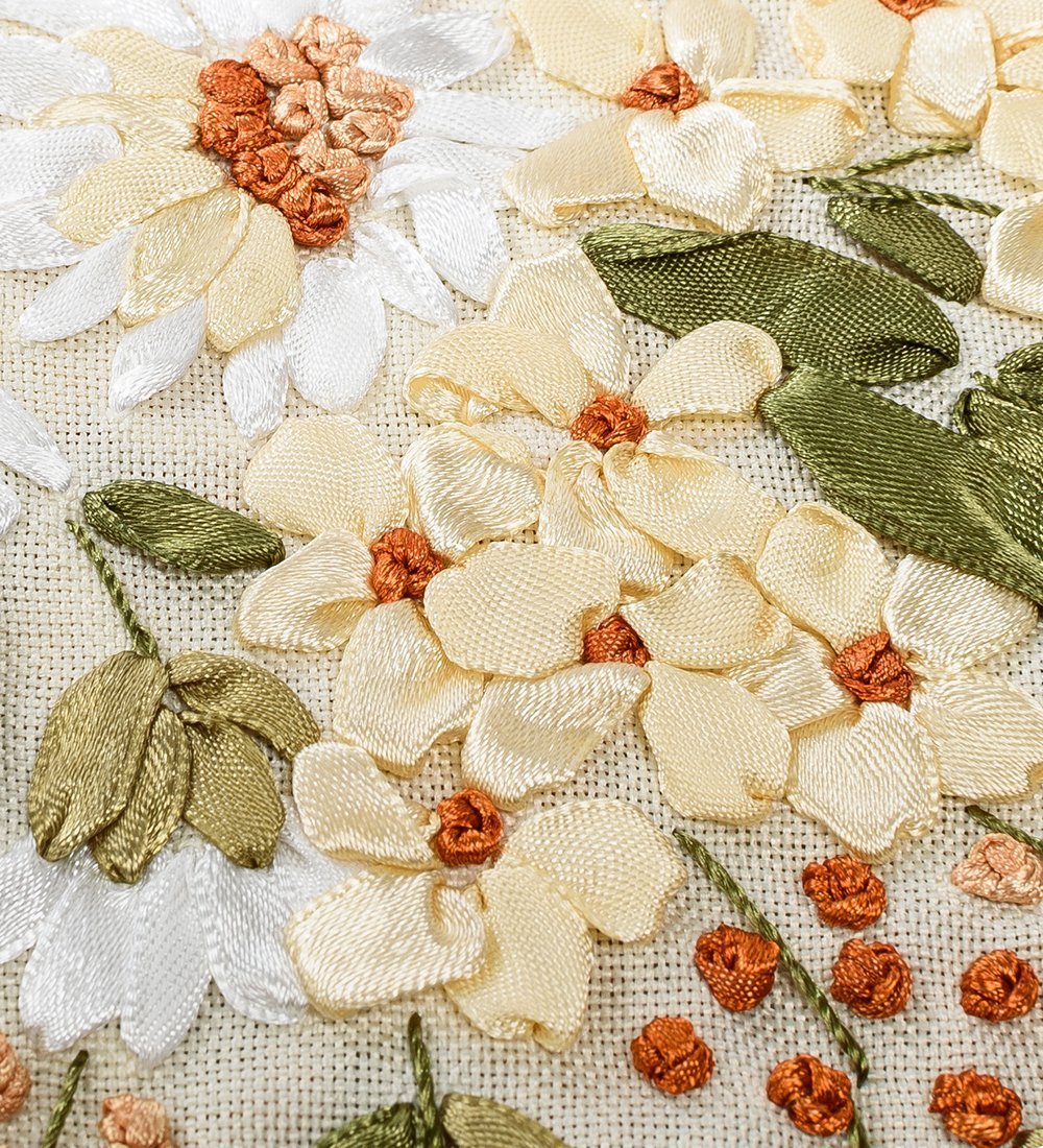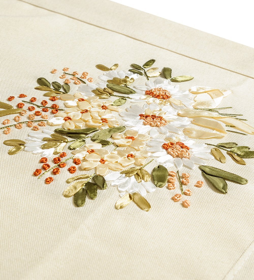 Скатерть квадратная кремового цвета. В уголках и центре набивная объёмная вышивка разноцветными атласными лентами.