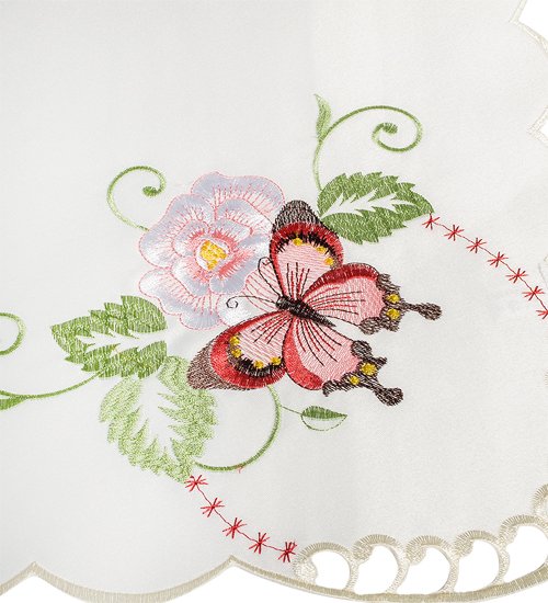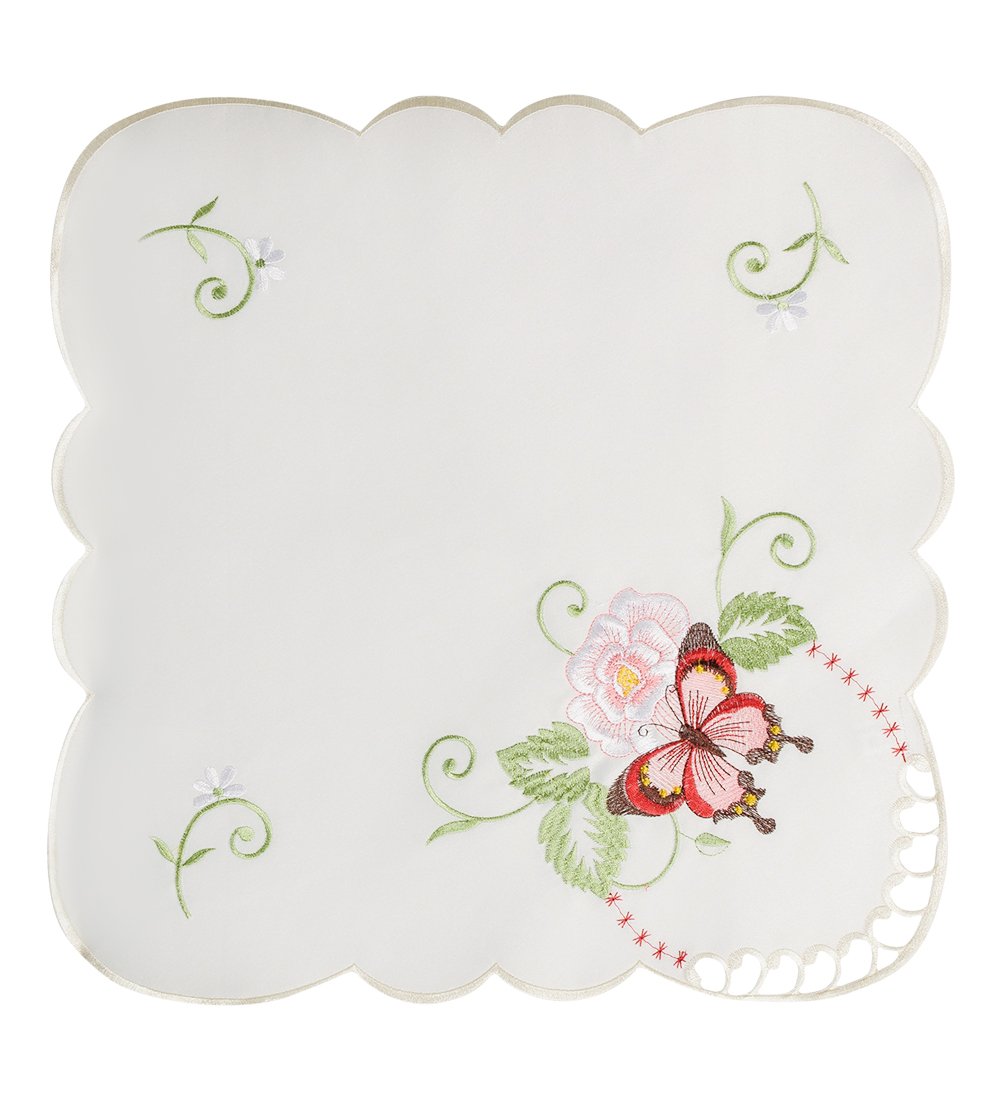 Салфеткаквадратная белая. В одном уголке цветная машинная вышивка, рисунок - бабочк, похающая над цветком. Край салфетки волнистый, оверложен белой нитью.