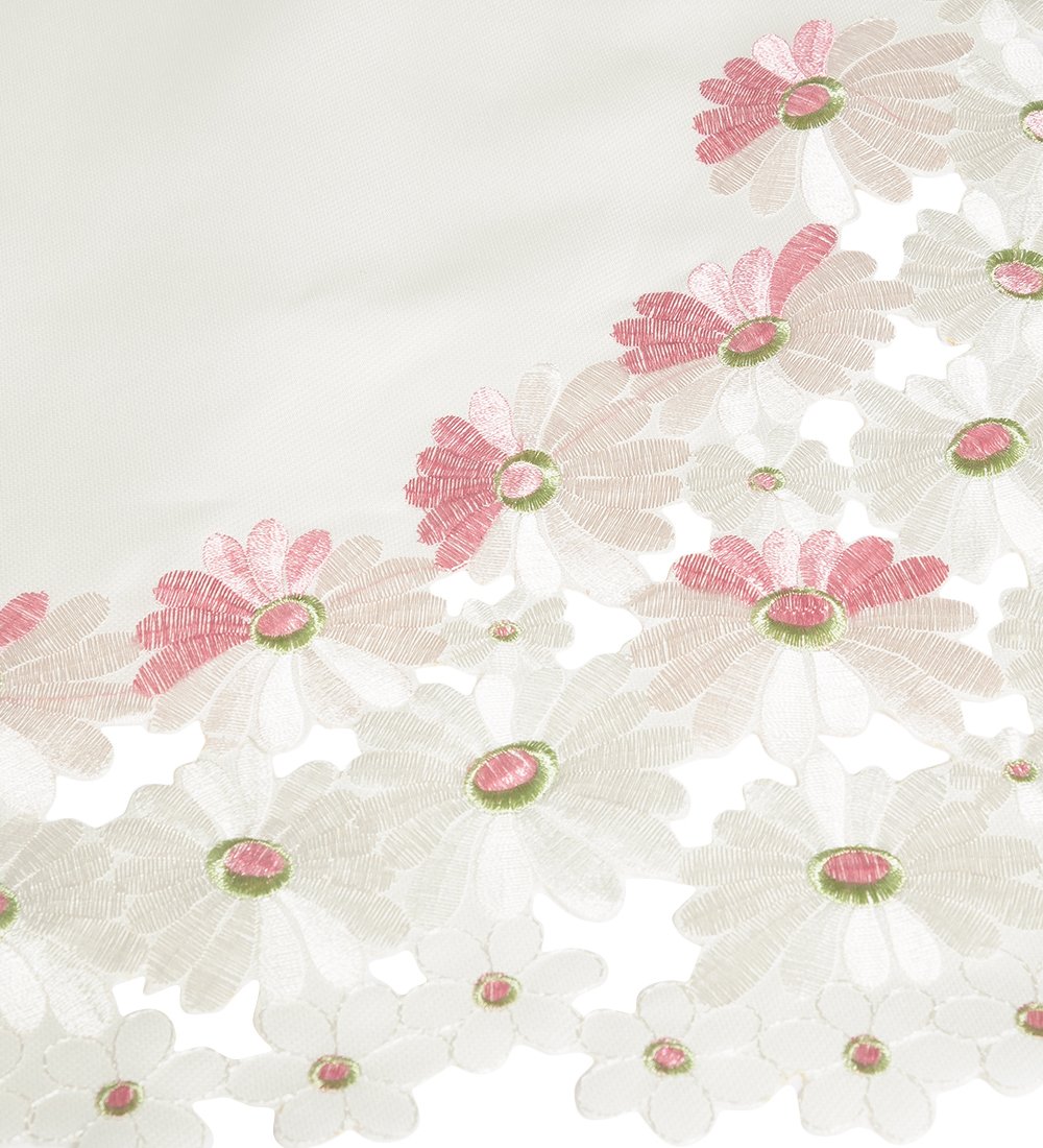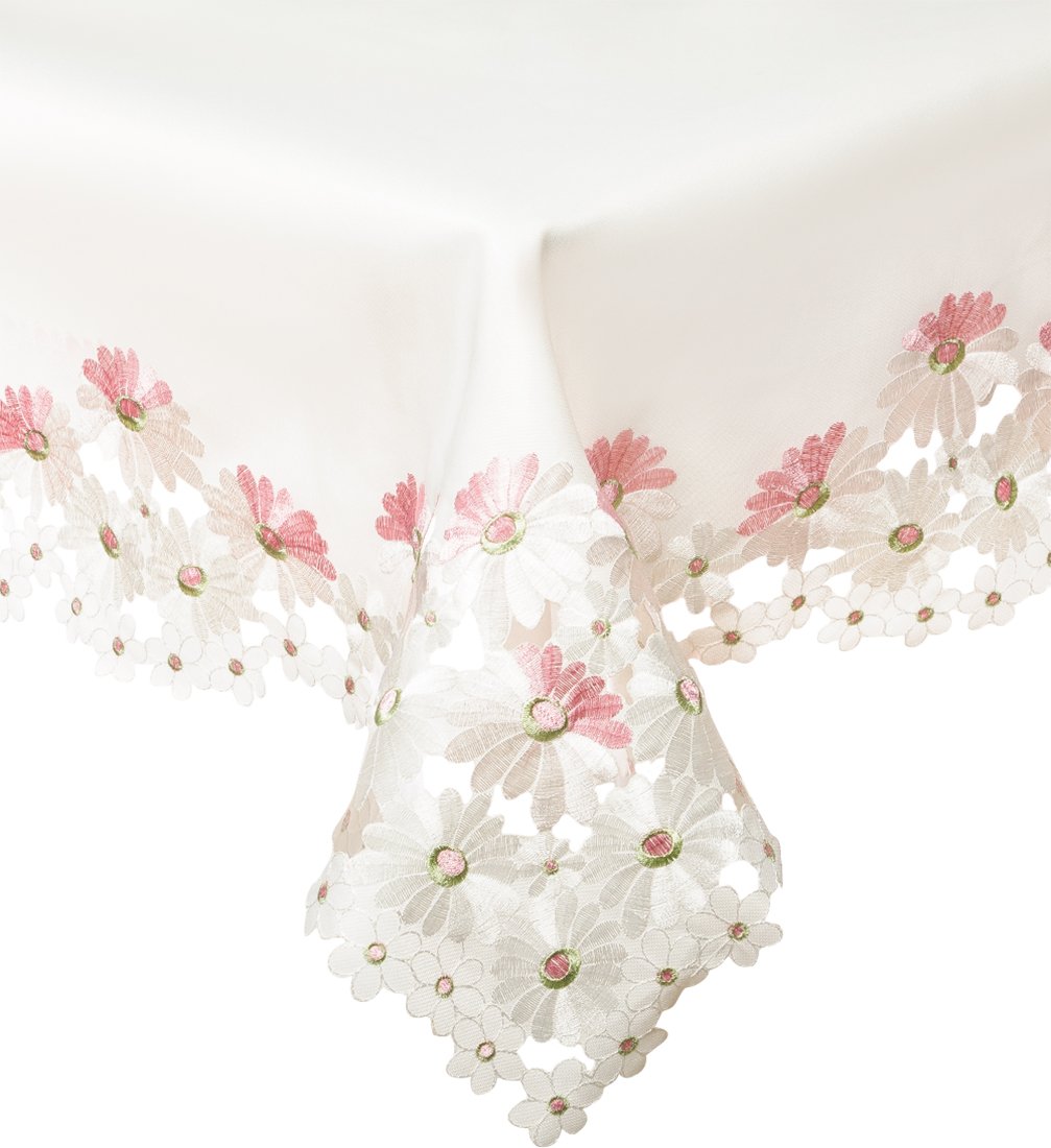 Скатерть банкетная белая прямоугольная. По краю цветная машинная вышивка гладью. Рисунок - узор из белых и розовых ромашек.