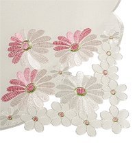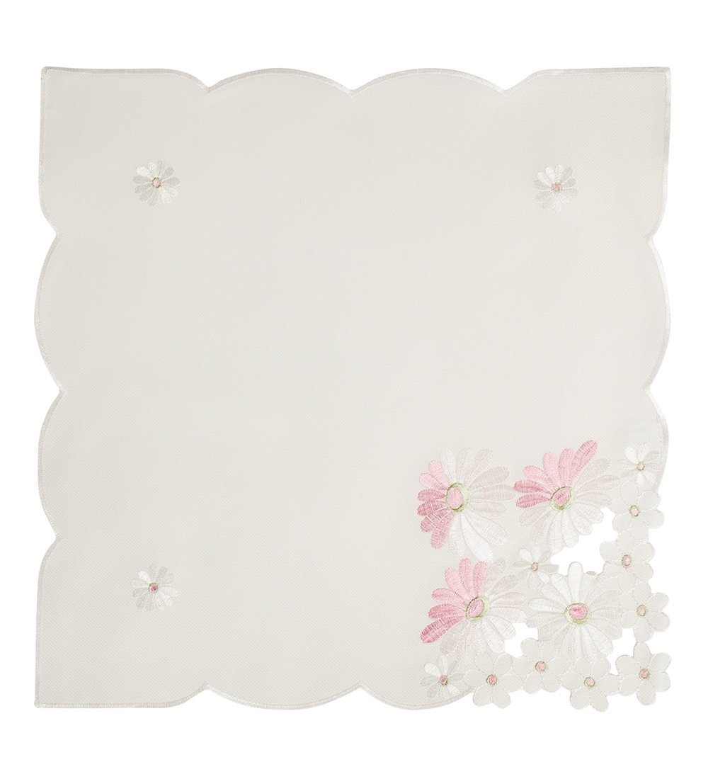 Салфетка банкетная белая квадратная. В уголке вышит гладью и выбит узор из белых и розовых ромашек.