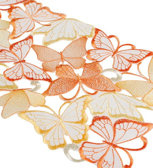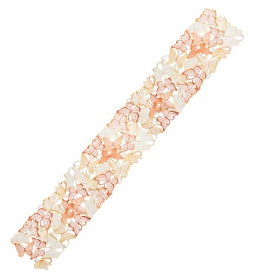 Скатерть банкетная прямоугольная кружевная. Вышивка машинная ажурная. На рисунке бабочки белого, желтого и оранжевого цвета. Используется в виде наперона.