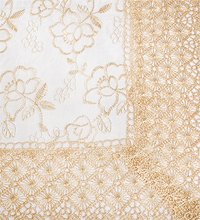 Скатерть квадратная двухслойная. Сверху расшитое кружево с вышивкой золотисто-карамельного цвета. Рисунок - розы.