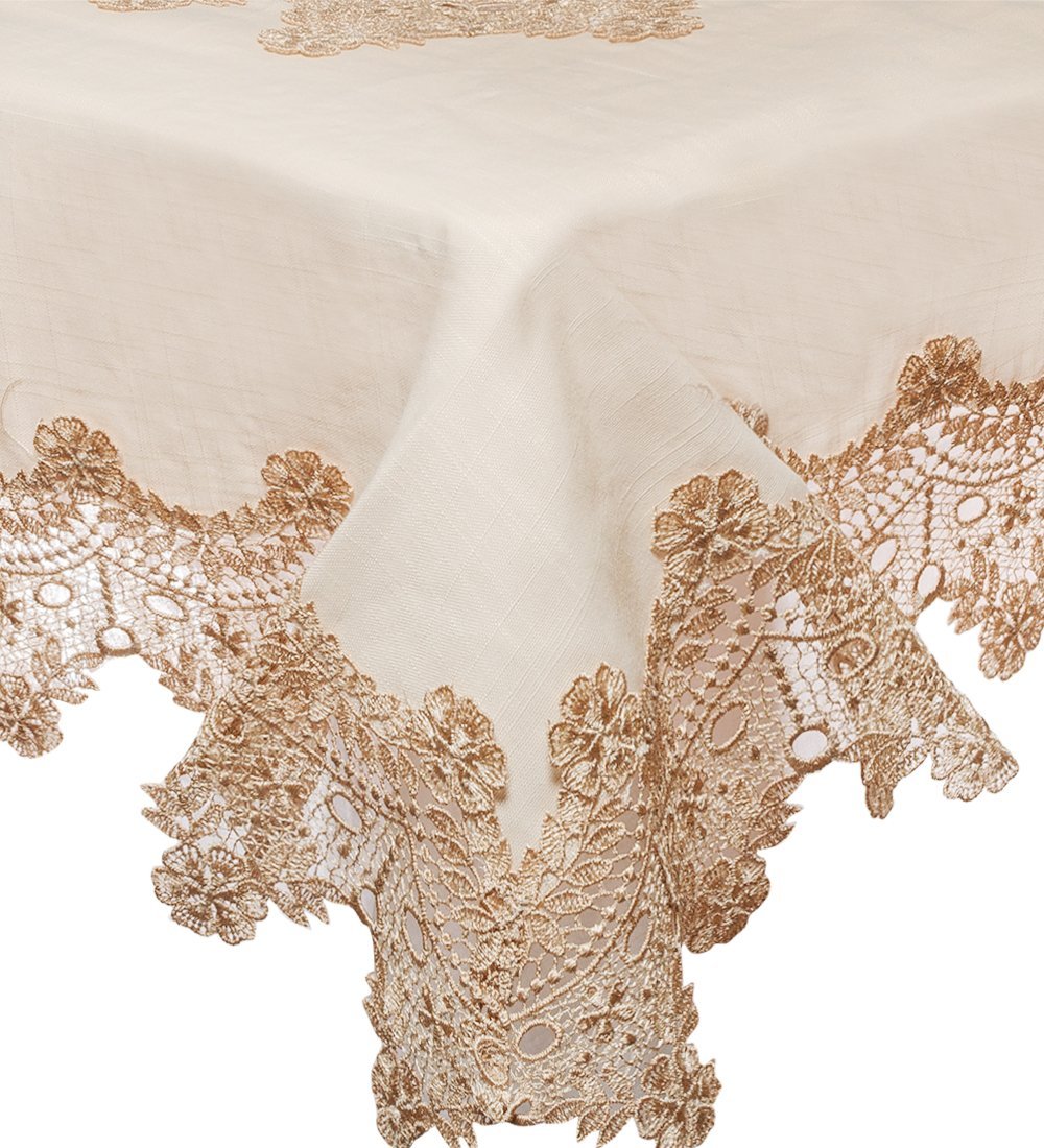 Скатерть квадратная с ажурным кружевом машинного вязания. Цвет - капучино. Кружевом на тон темнее выложено в центре скатерти в виде ажурной салфетки и обшито по краю.