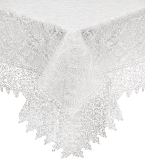 Скатерть белая банкетная прямоугольная. На непрозрачной основе лежит гипюр, по краю белое воздушное кружево.